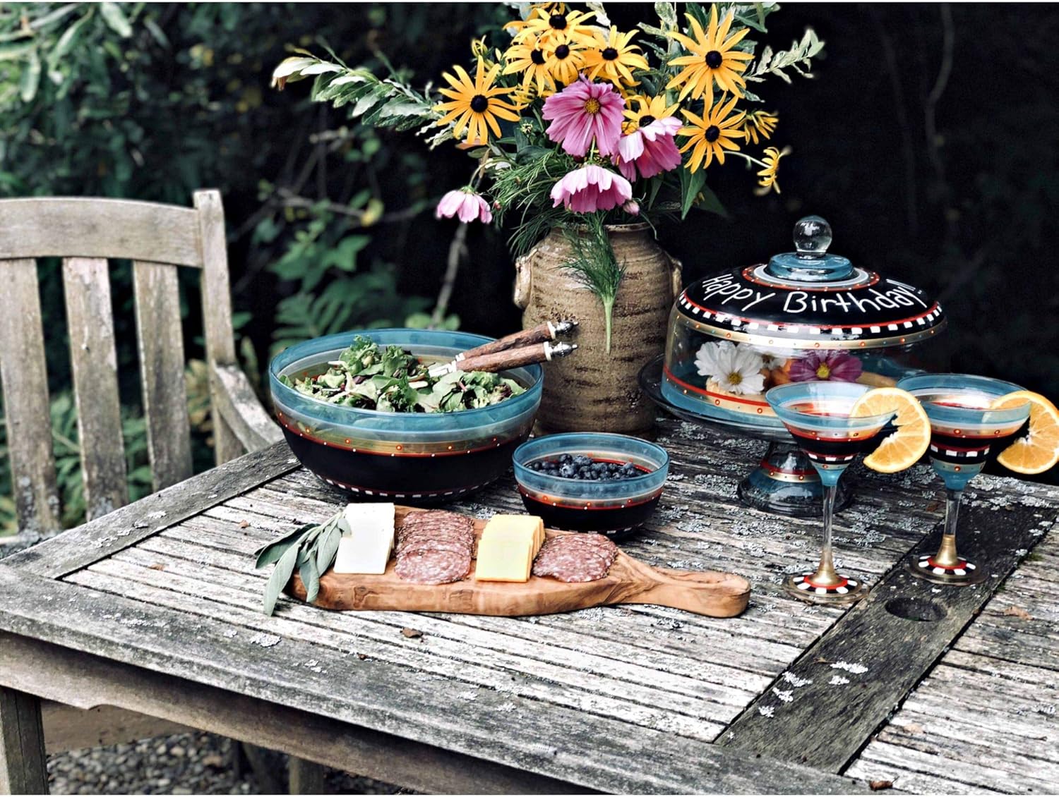 Set of 2 Mosaic Chalkboard and Stripes Hand Painted Glass Serving Bowls 6"