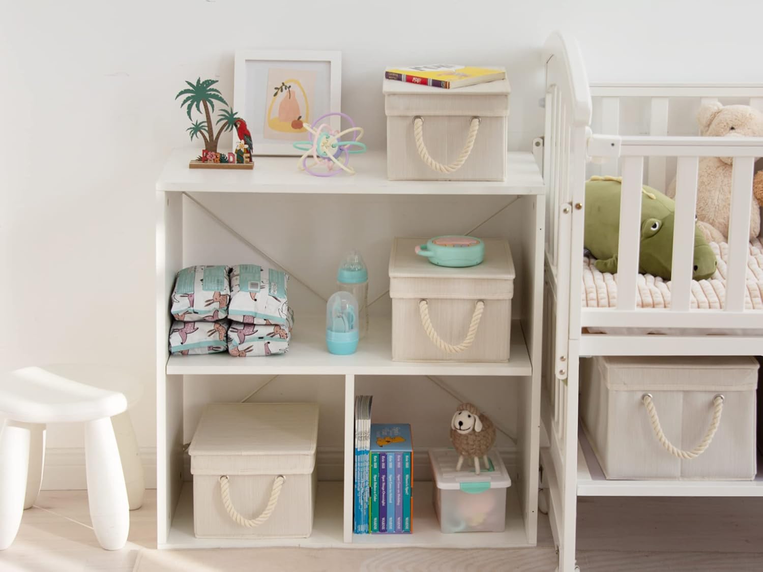 • Thick fabric storage boxes with lids reinforced with heavy-duty boards.