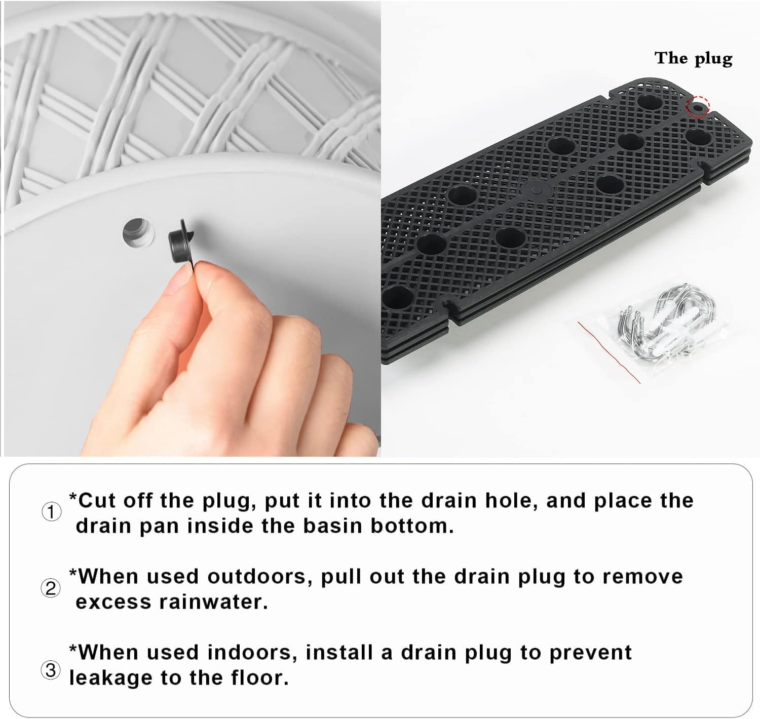 - Use instruction: Cut down the plug and put it into the drain hole,then place the drain pan at the pot bottom. Pull out drainage plug to allow for the removal of excess rainwater when installed outdoors. Install drainage plug when used indoors.