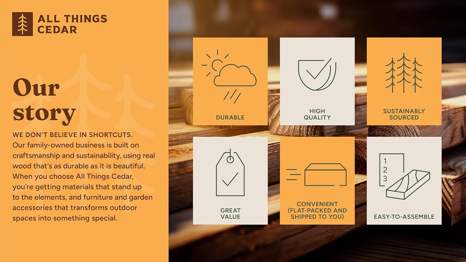 • Quality Craftsmanship: Each piece is crafted with precision, boasting snug-fitting parts and a smooth sanded finish. This meticulous attention ensures not only a seamless assembly but also a refined aesthetic that highlights the innate allure of cedar wood. Enjoy the beauty of craftsmanship that enhances your outdoor sanctuary.