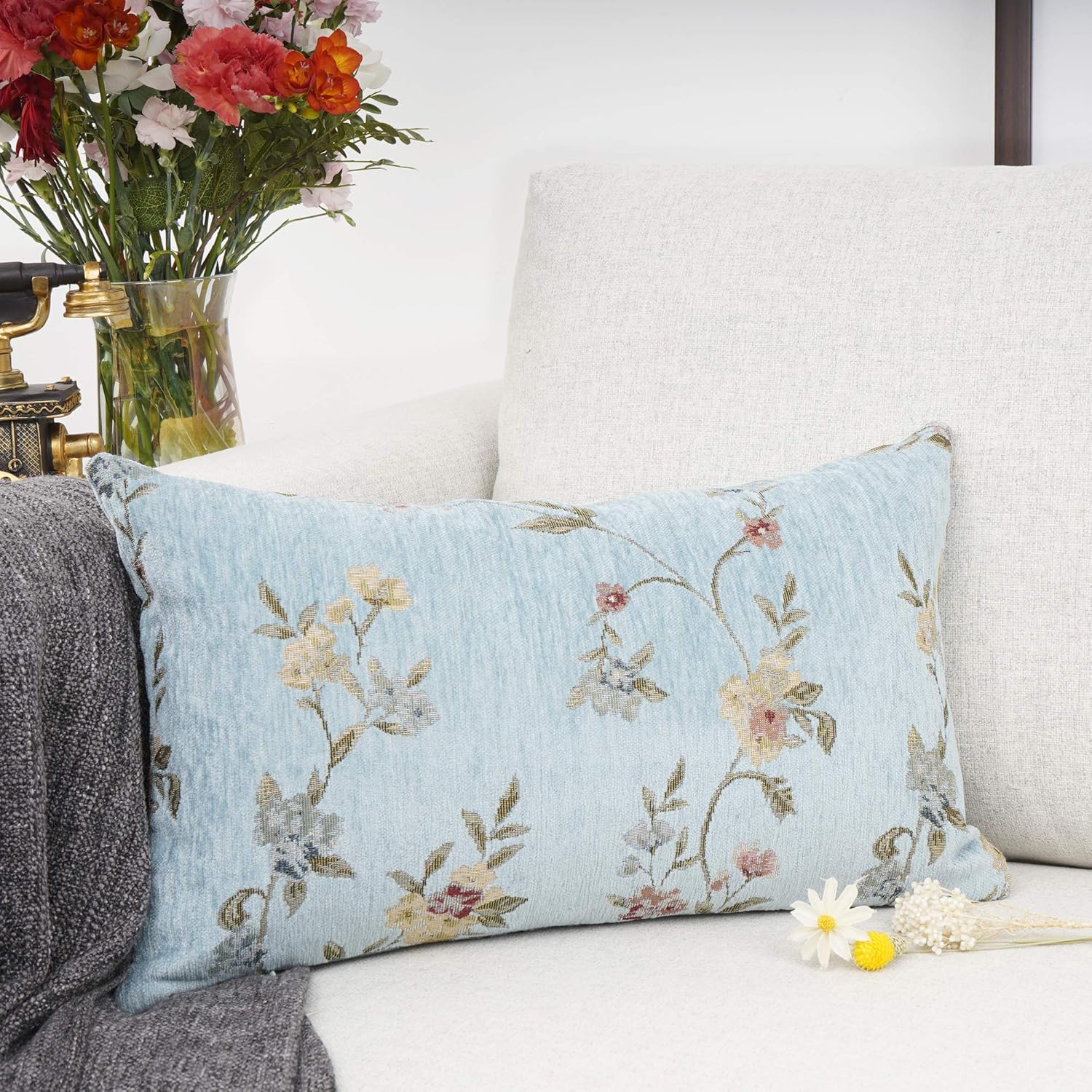 YOUR SMILE Classical Embroidery Jacquard Farmhouse Oblong Rectangle Chenille Teal Floral Pattern Decorative Throw Pillow Case,12x20 inch