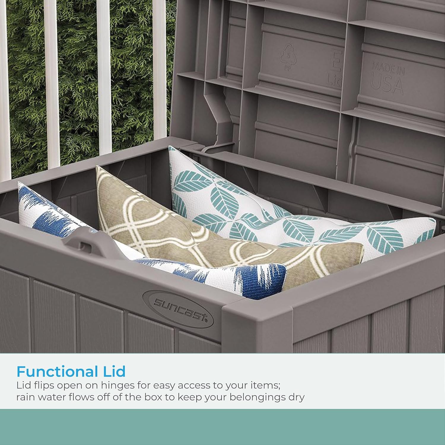 Suncast 22-Gallon Small Deck Box - Lightweight Resin Indoor/Outdoor Storage Container and Seat for Patio Cushions and Gardening Tools - Store Items on Patio, Garage, Yard - Stone Gray, Made in the USA