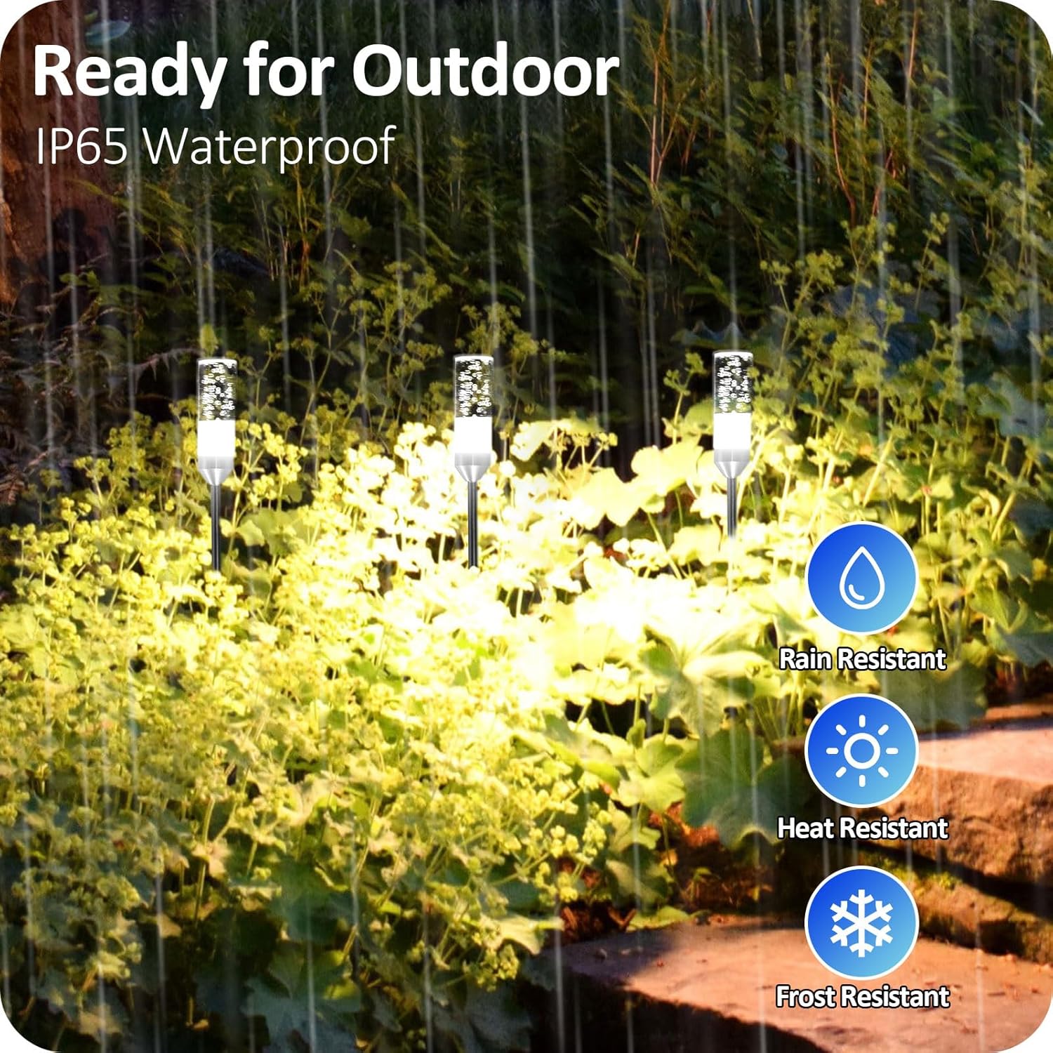 - Unique Design: The crystal-like transparent light body brings a elegant, special style to your yard. There are tiny bubbles in light, as if a string of crystal clear pearls suspended among them. The ideal garden light, emitting clear led light at night; high CRI, let the light faithfully illuminate all the colors in your garden, let your night also colorful.