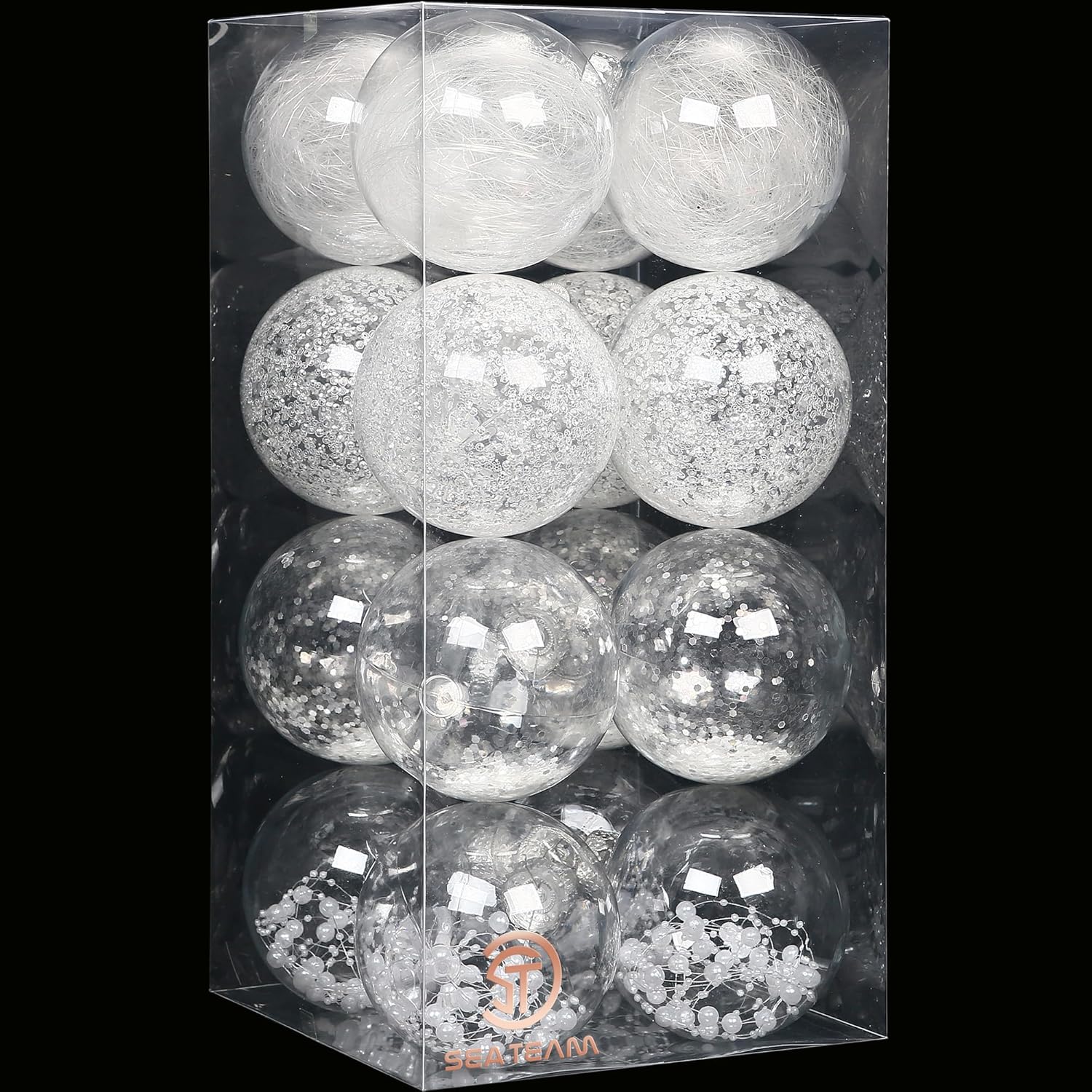 Sea Team Shatterproof Clear Plastic Christmas Ball Ornaments Decorative Xmas Balls Baubles Set with Stuffed Delicate Decorations (100mm/3.94''/16-Pack, White)