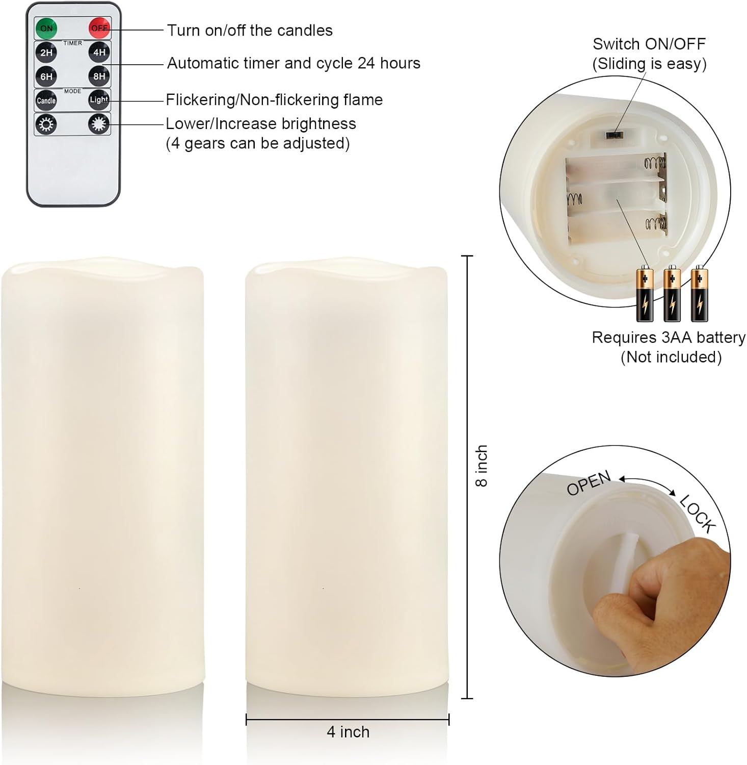 - Package Include 2x large outdoor candles (8โ in height, 4โ in diameter), 1x Remote Control, which are better using inside the indoor or outdoor lanterns. Please donโt soak them in water because prolonged soaking will invalidate the waterproof function.