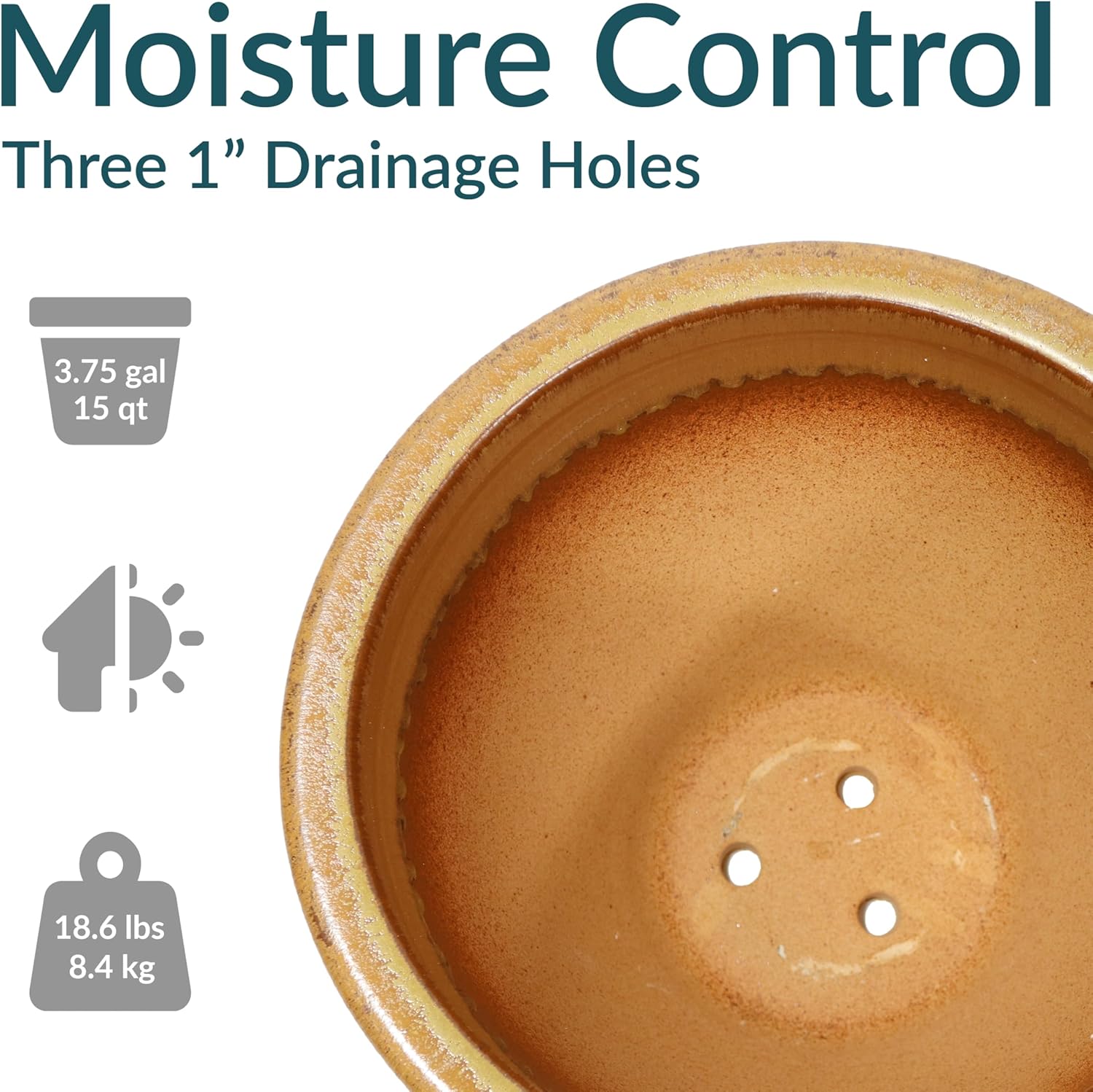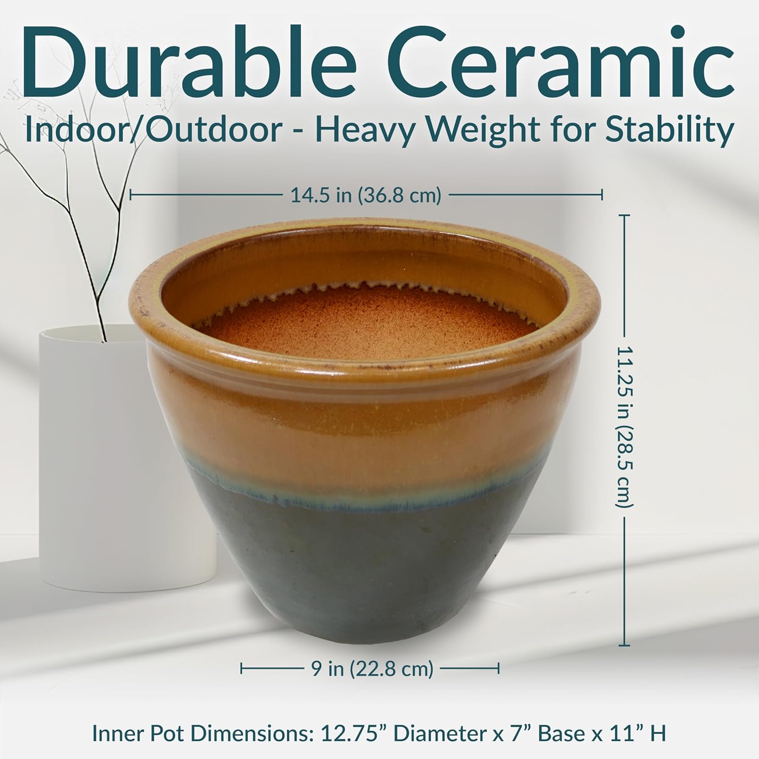 - LARGE SIZE FOR GROWING PLANTS: This large plant pot features a spacious top diameter and 3.75-gallon soil capacity that provides ample space for plants to grow. The planter has a 14.5” outer top diameter (12.75” inner diameter), a 9” outer base diameter (7” inner base diameter), an 11.25” outer H (11” inner H), and weighs 18.6 lbs.