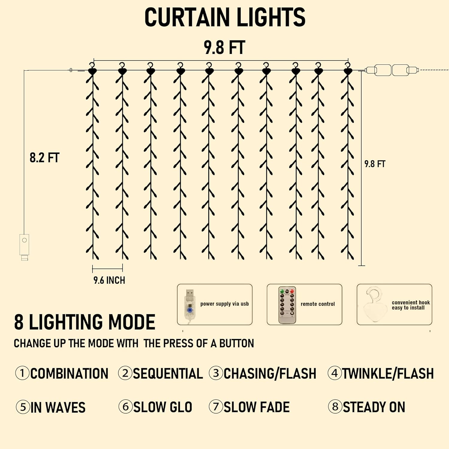 • 8 modes setting: Funpeny LED curtain string lights has 8 lighting modes(Combination, In waves, Sequential, Slow Glow, Chasing/Flash, Slow fade, Twinkle/Flash, Steady on). Beautiful and practical, multiple functions can meet your needs.