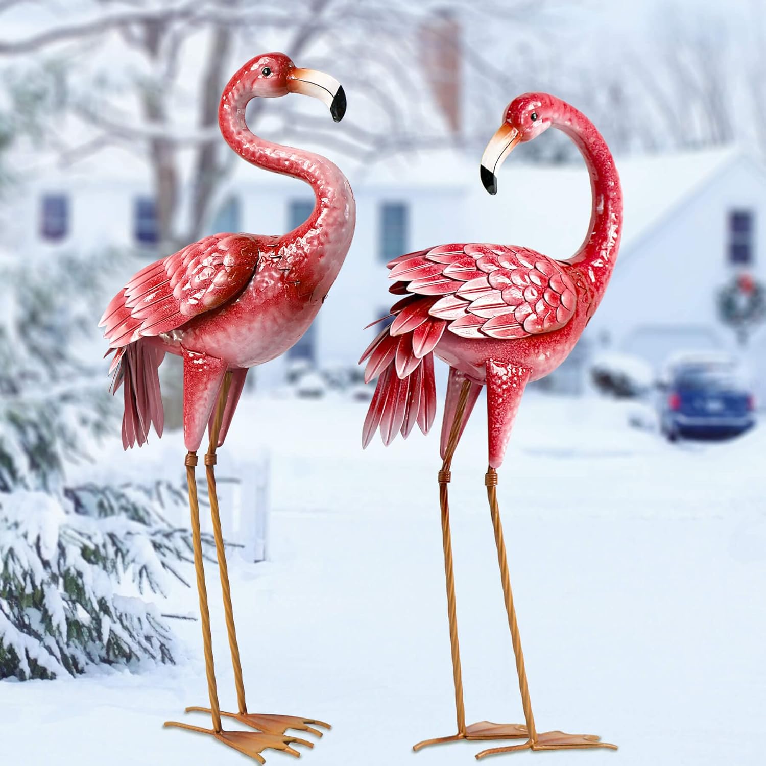 - Lifelike Detailing: These flamingo statues are so realistic, made of textured and layered metal sections and hand-painted pink finish. With 2 different pose that will add a fun twist and vivid touch to your outdoor space.