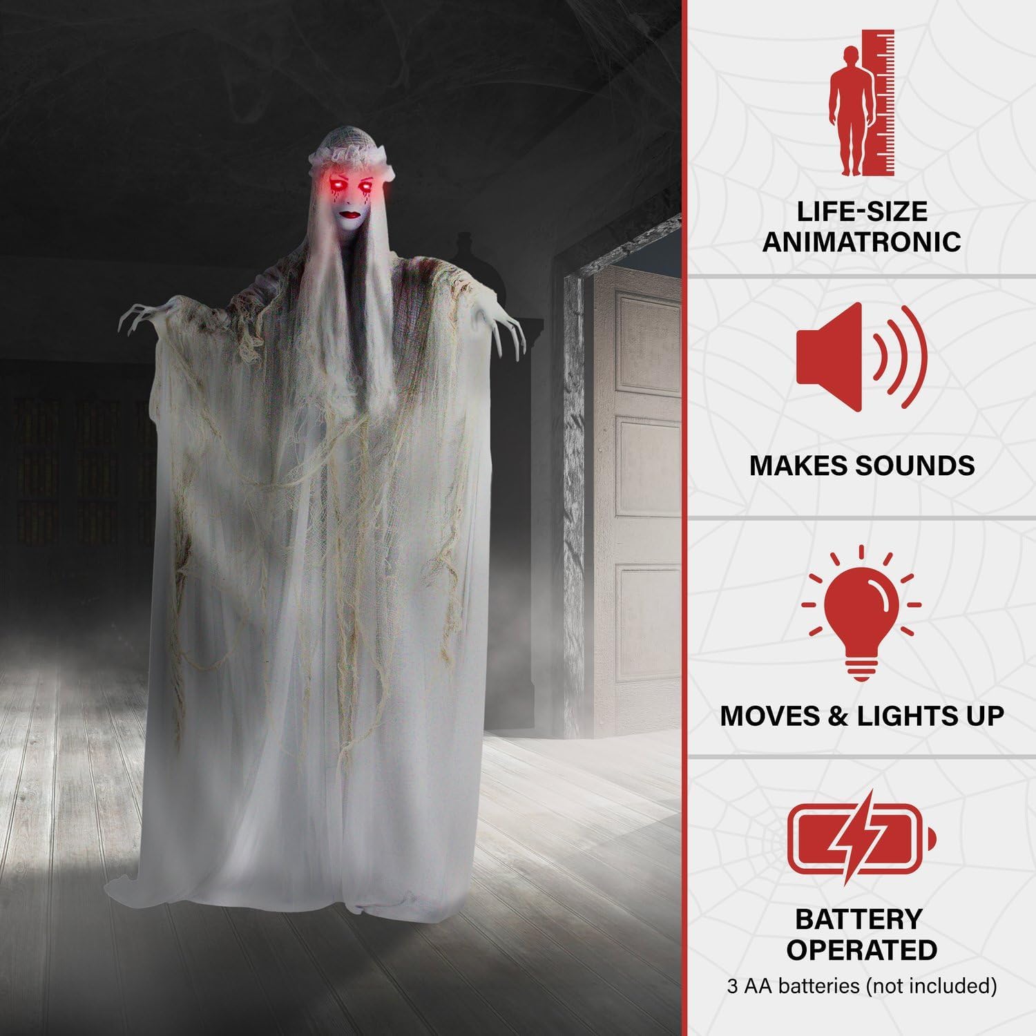 - Makes Noise: Creepy animatronic bride moans hauntingly to startle even your most stoic visitors