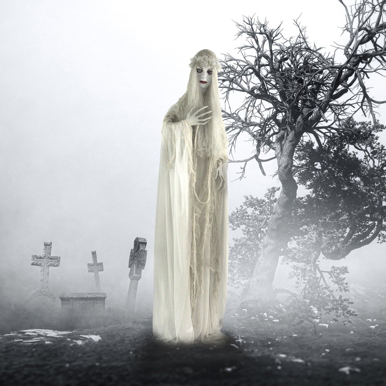 Haunted Hill Farm Life-Size Scary Ghost Bride, Halloween Animatronic with Touch Activated Lights and Sound, Battery Operated Indoor or Covered Outdoor Halloween Decorations, Creepy Halloween Prop