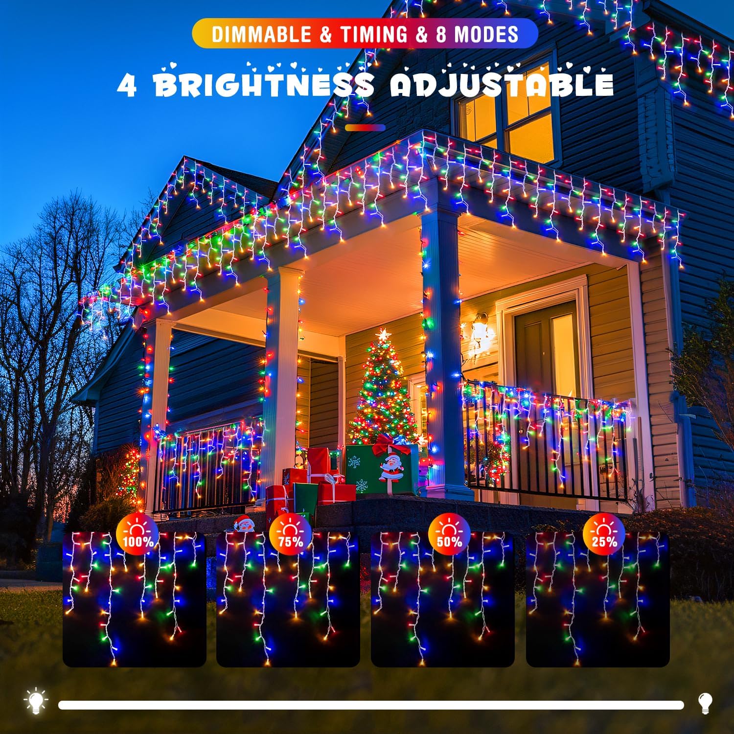 - ă8 LIGHTING MODES & TIMER FUNCTION ă Multiple selection of light patterns. the different settings are a lot of fun. Fascinating multicolor icicle lights for my porch with colorful lighting options! They look gorgeous in Mode 'Chasing/Flash' on our patio. Of course Mode âTwinkle/flashâ is very Christmas. Our icicle lights also have timing function, which automatically turns on for 6 hours and turns off for 18 hours