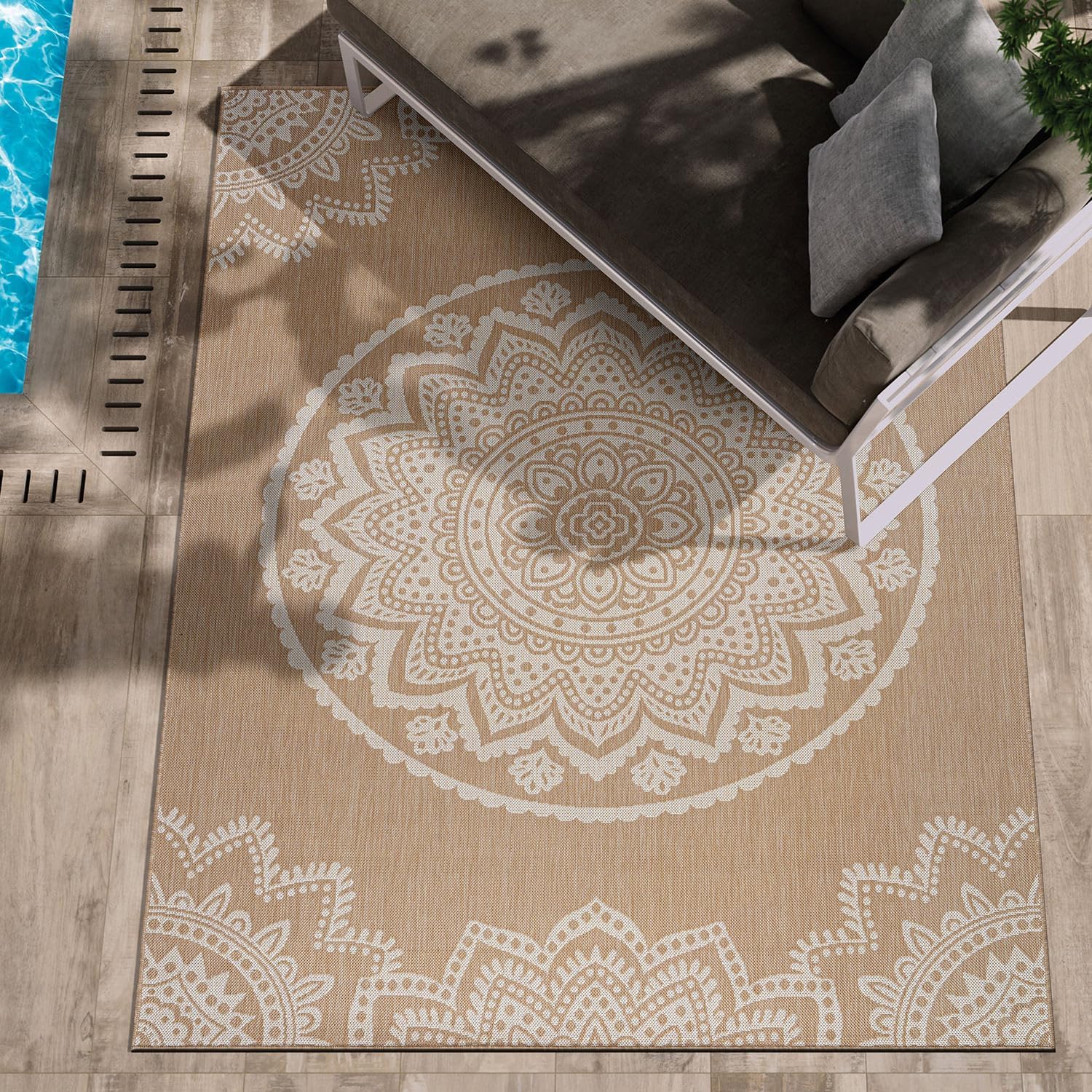CAMILSON Outdoor Rug 5x7 Modern Area Rugs for Indoor and Outdoor Patios and Porches - Waterproof, Washable, Non-Shedding, Easy-to-Clean Outside Carpet (5 x 7, Medallion - Beige/White)