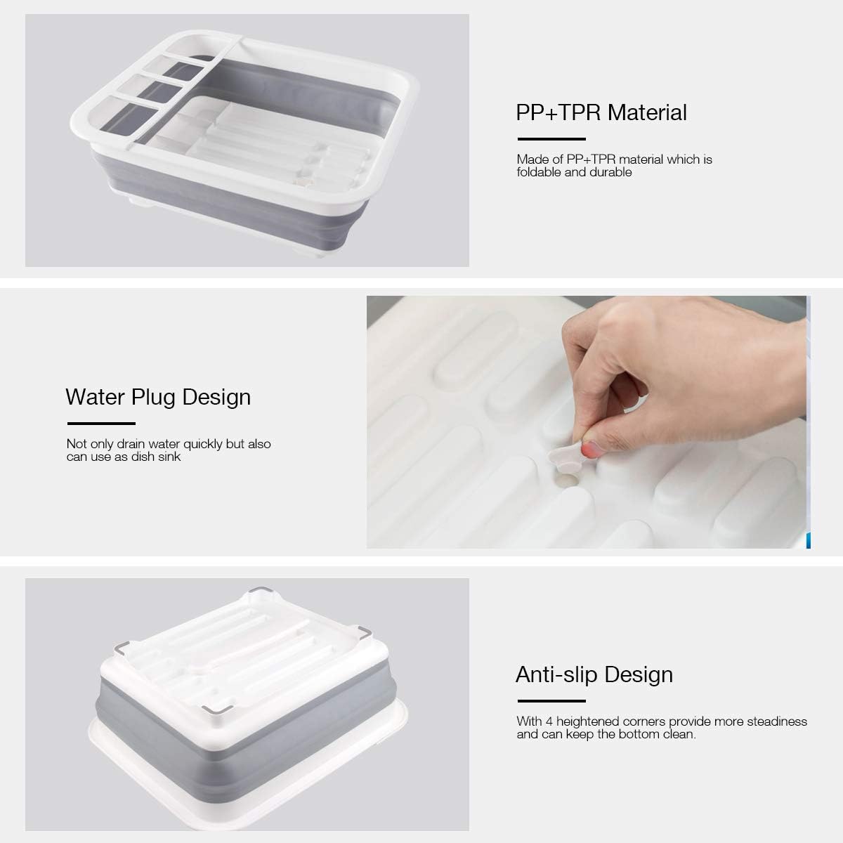 - ăDrying Water QuicklyăThe collapsible dish storage rack versatile tool for all your household tasks, at the same time, will not hurt your hands or scratch the sink. The Bottom with an adjustable swivel drain strip allows water to run directly into the sink, keeping your counters clean and dry.