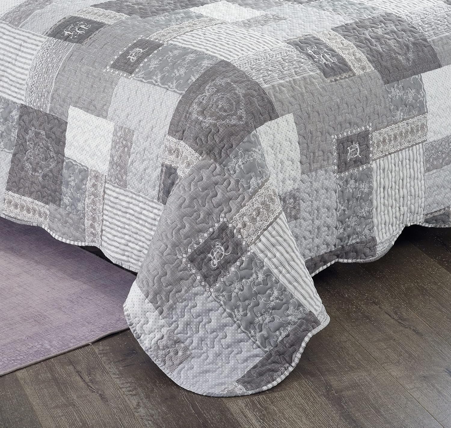 Brilliant Sunshine Grey Heart Love, Floral and Lace Patchwork, 3-Piece Quilt Set with 2 Shams, Reversible Bedspread, Soft Lightweight Coverlet, All-Season, Full/Queen, Grey