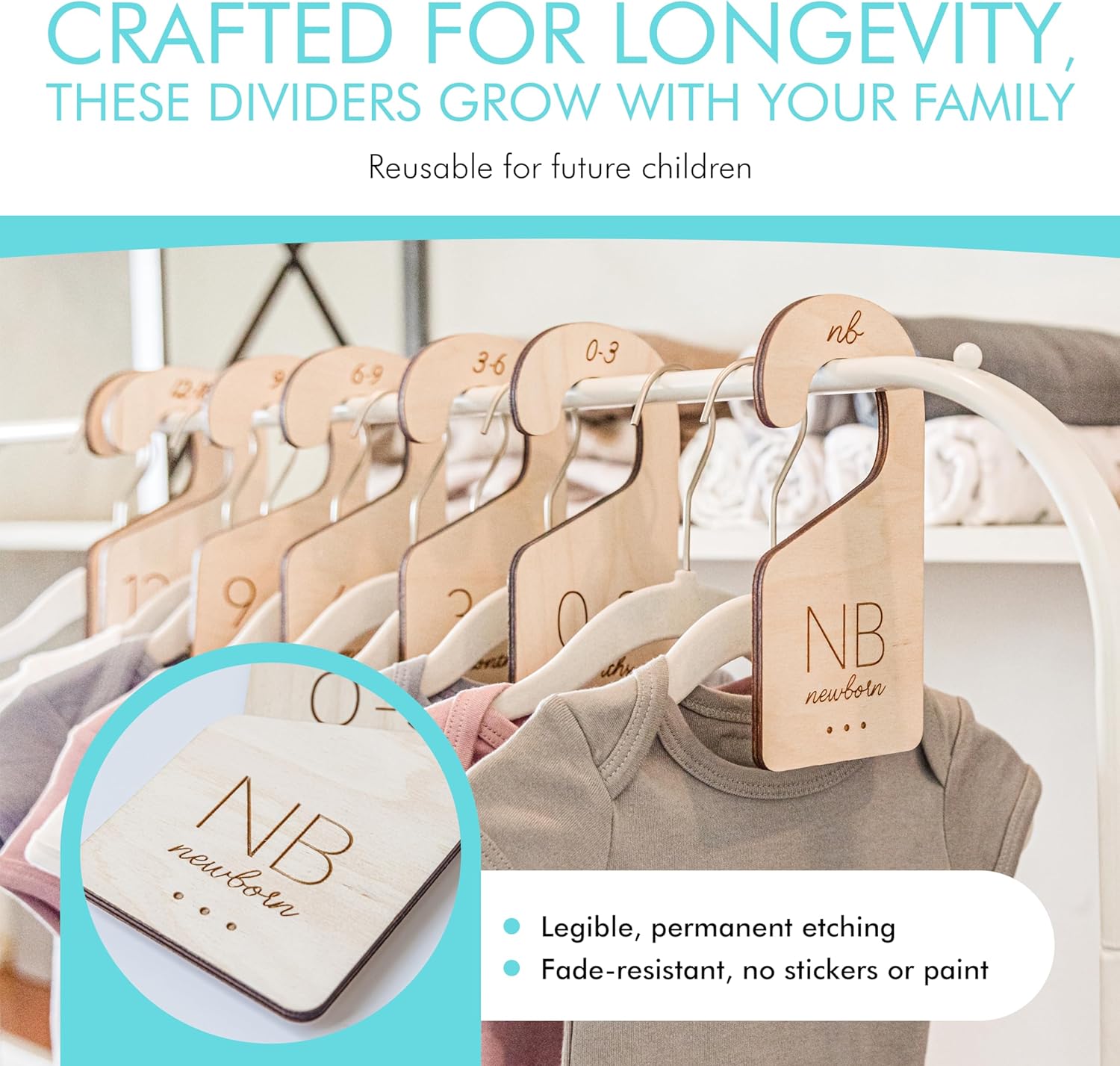 - ORGANIZATION MADE EASY - Organizing your baby's wardrobe is a BREEZE with our baby clothes dividers for closet that cover sizes from newborn to 18-24 months, so you can always sort and arrange baby clothes in order with wooden baby hangers.