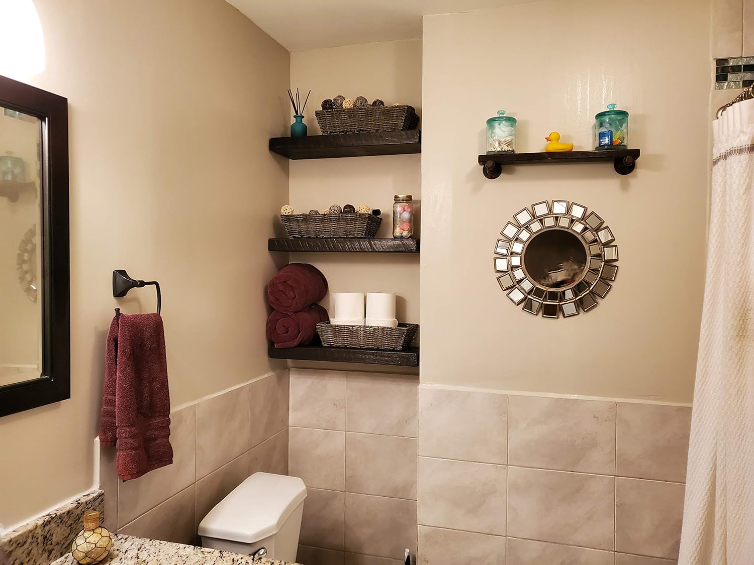 - Elevate Your Space with Rustic Charm: Transform your living room or any space with our large floating shelves for wall. These 24 inch floating shelf beauties, crafted from natural wood, add a touch of rustic warmth and provide ample display space for your cherished items. These are a great depth for photos, and organizing small areas. NOTE: You need to be able to hit one wood stud toward the center of where you want to hang the shelf.