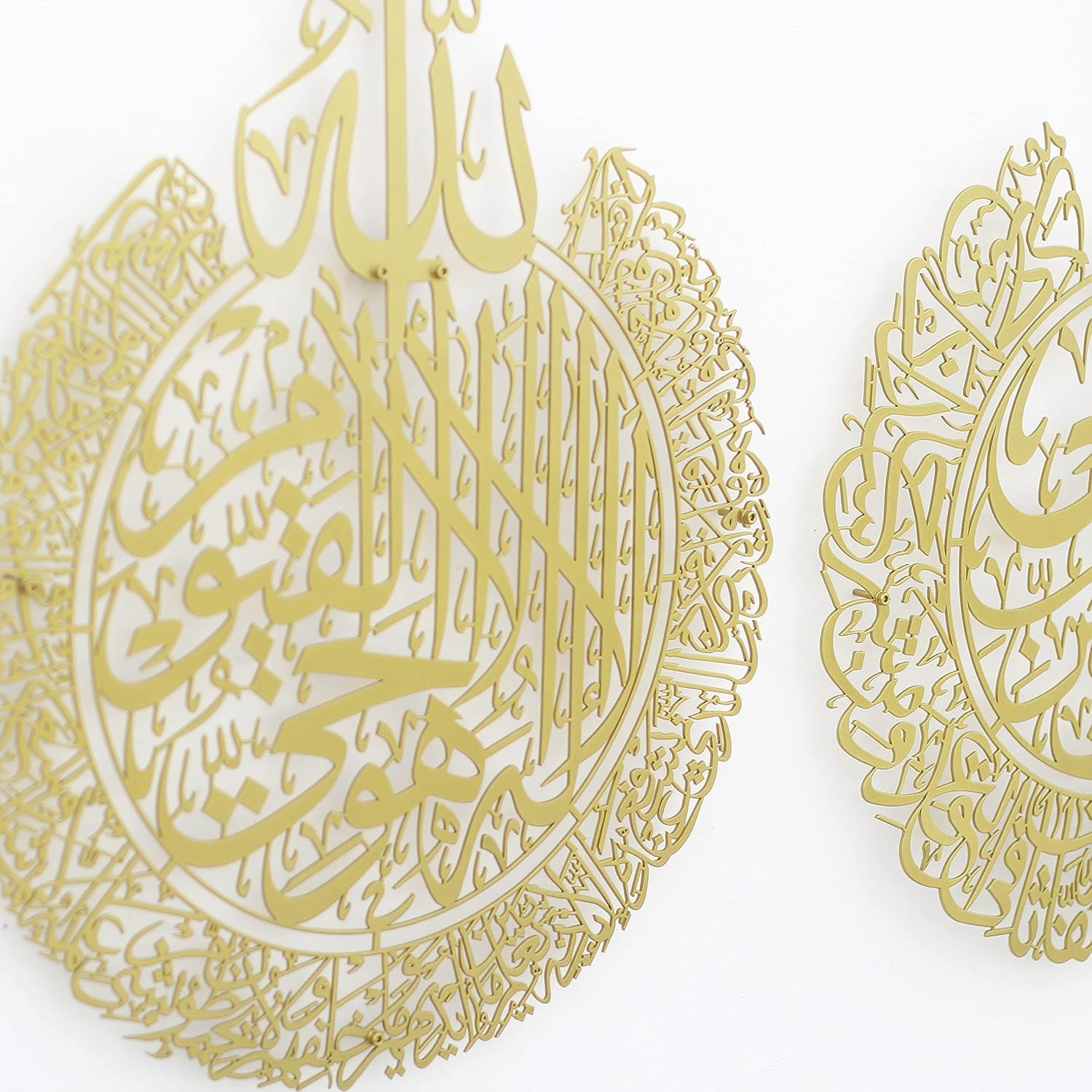 - The Elegance of Art: Crown your home with this elegant metal Islamic wall art. Featuring the Ayat al-Kursi, Surahs al-Falaq, and al-Nas, it's a magnificent union of Quranic verses and masterful Arabic calligraphy.