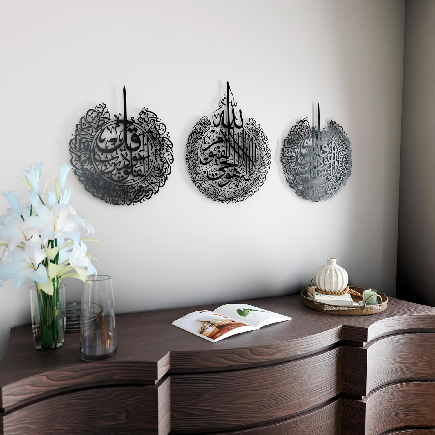 - The Elegance of Art: Crown your home with this elegant metal Islamic wall art. Featuring the Ayat al-Kursi, Surahs al-Falaq, and al-Nas, it's a magnificent union of Quranic verses and masterful Arabic calligraphy.