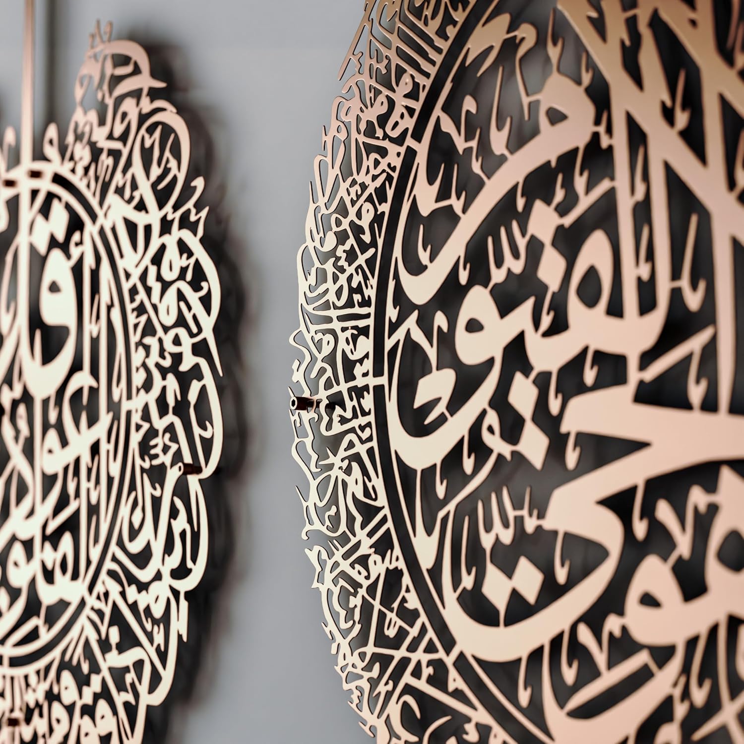 - The Elegance of Art: Crown your home with this elegant metal Islamic wall art. Featuring the Ayat al-Kursi, Surahs al-Falaq, and al-Nas, it's a magnificent union of Quranic verses and masterful Arabic calligraphy.
