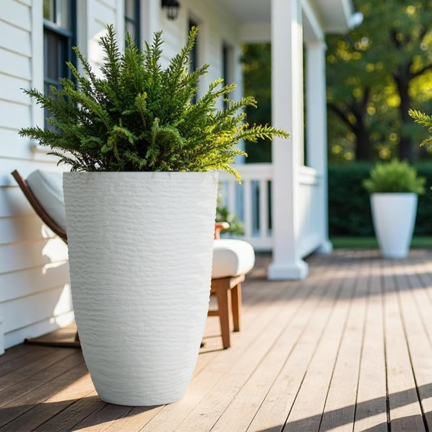 - Classic Appearance: Its curved silhouette and raised details offer up a touch of classic character, while a solid matte finish with grain texture updates the look; These tall tree planter is an ideal for a patio accent or flanked along an entrance wall; Gives your tall plants a tall planter! Size:14'' (Dia.) x 20.5'' (H.)