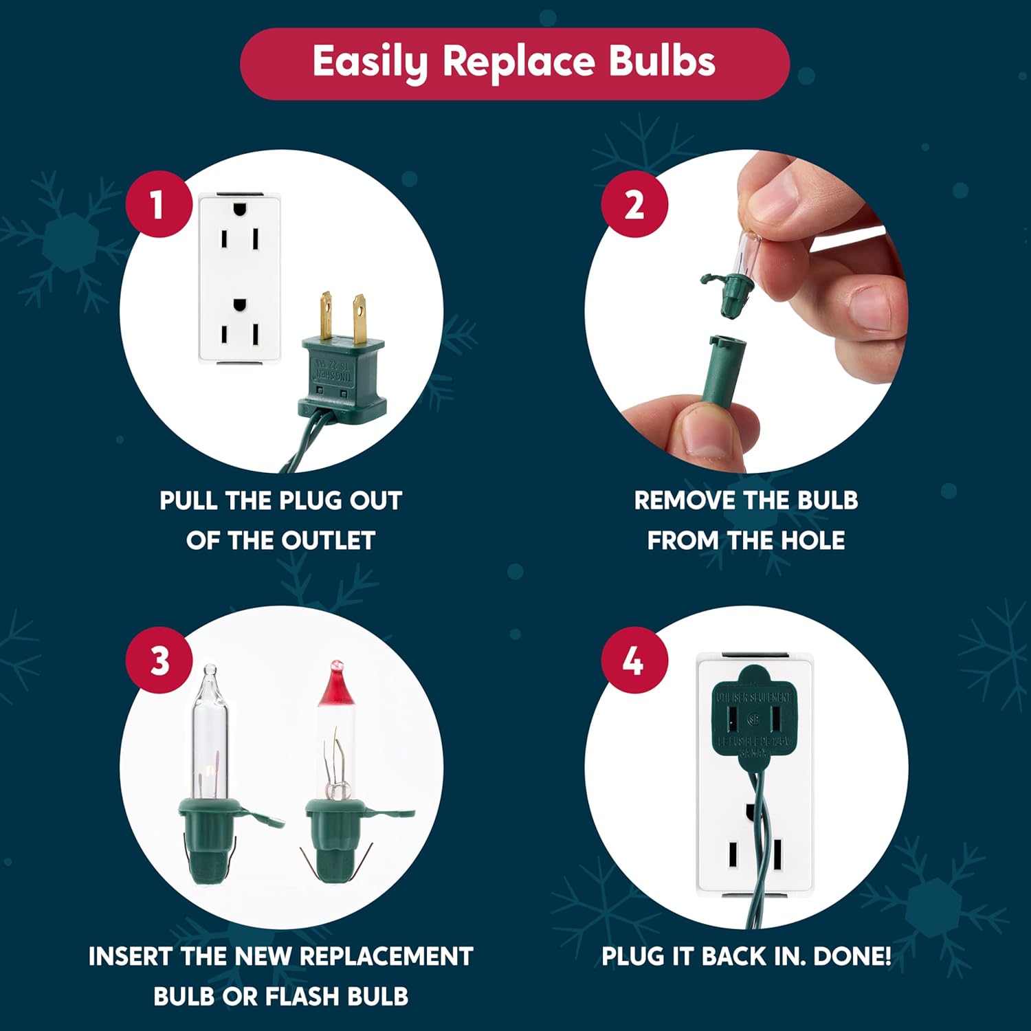 - INDEPENDENT CIRCUIT & REPLACEMENT BULBS - Enjoy a hassle-free holiday! Our lights feature an independent circuit system; if one bulb burns out, the rest stay lit. The set includes 3 spare bulbs, a replacement fuse, and 3 test flash bulbs., ensuring your display stays bright throughout the season without needing a full replacement.