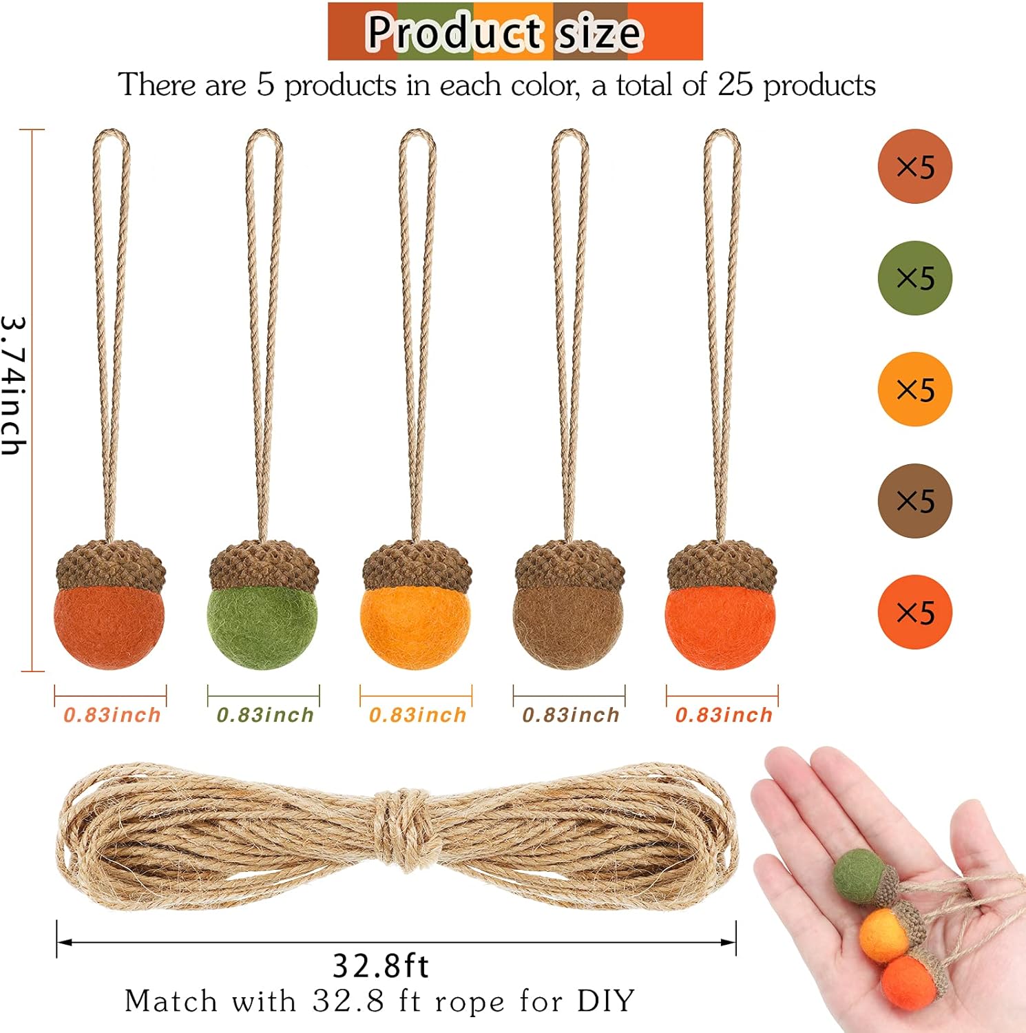 Tatuo 25 Pcs Fall Felt Acorn Ornament Hanging Wool Felted Acorn Garland for Fall Tree Ornament Thanksgiving Felt Ball Pom Decor with Rope for Thanksgiving Christmas Tree Mantel Wall Home