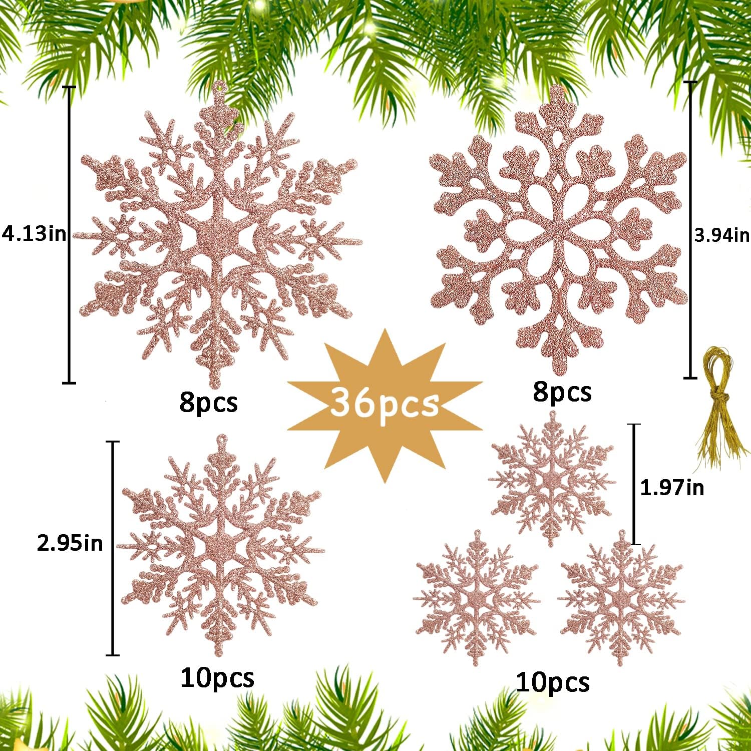 - SNOWFLAKES OF VARIED SIZES: A value pack of 36pcs rose gold Christmas glitter snowflakes in 3 varied sizes and 2 different patterns: 8pcs for 4.2 inch for both styles, 10pcs for 3 inch and 10pcs for 1.8 inch. Itβs a lot of snowflakes sufficient for your Christmas decorations