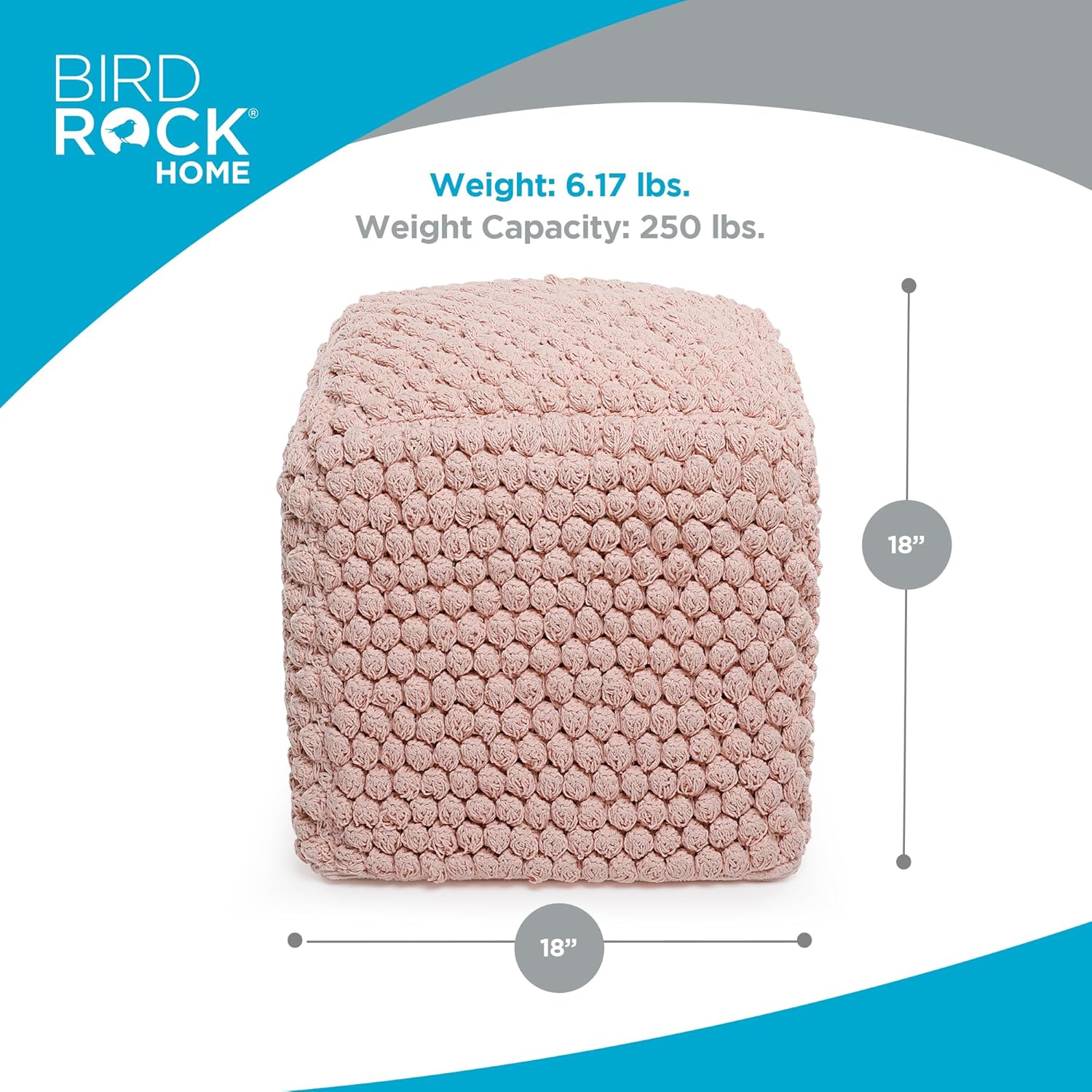 - PRODUCT SPECS: The pouf measures 18β L x 18β W x 18β H and weighs 6.17 lbs. Made from durable cotton with bead filling and a sturdy inner box, it combines comfort with long-lasting use. Care is simpleβspot clean with a damp cloth for easy maintenance.