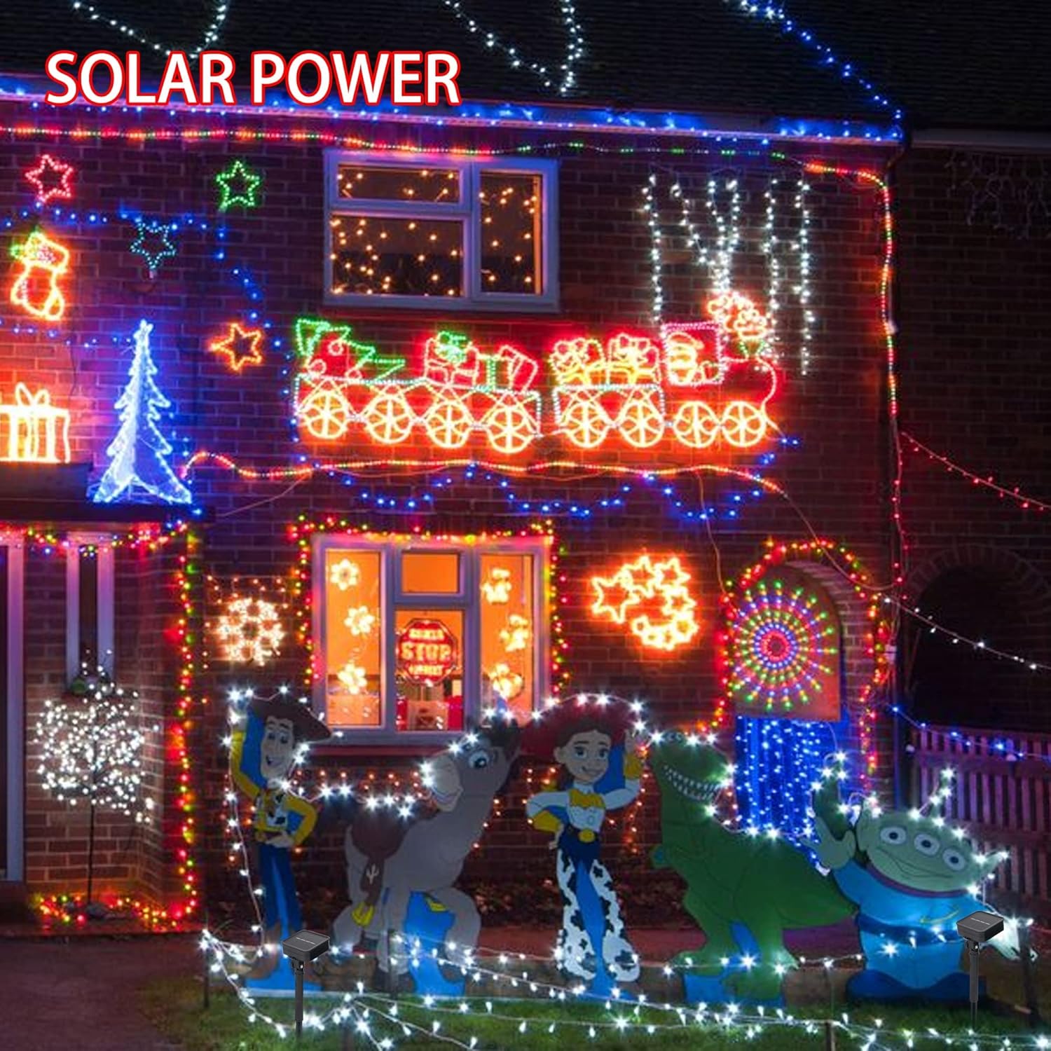 - 2 Pack Christmas Solar String Lights: Dazzle Bright solar lights comes with 120 LED bulbs. Bright Christmas lights exude a 360 degrees charming white light, add a soft and warm festival glow to your home. The solar christmas lights is 39.4 ft, lead wire is 6.5 ft, bulb spacing is 3.94 inch. Total length is 45.9 ft.