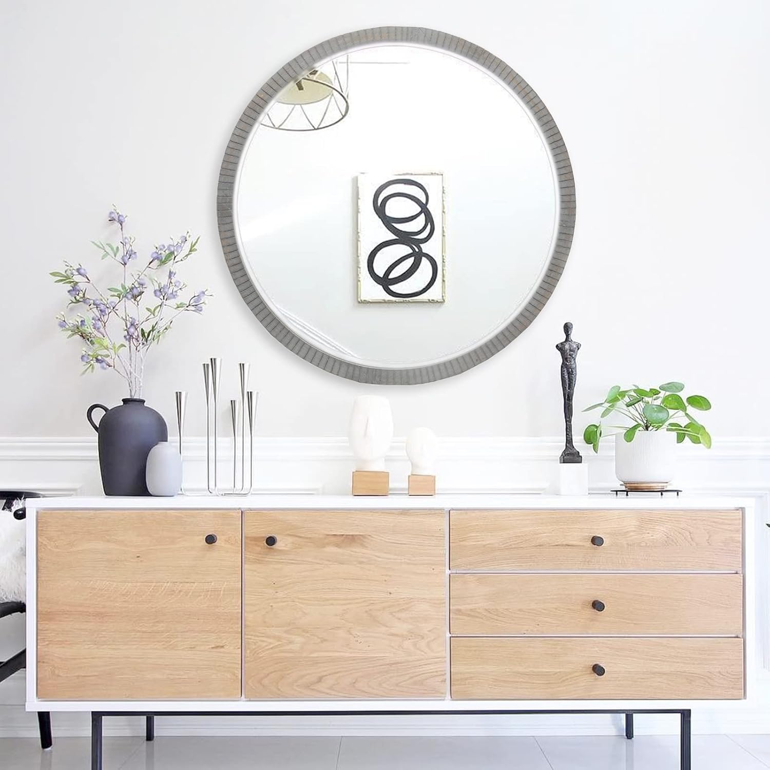 - NATURAL HOME DECOR: The element design of this round mirror 35 inches allows it to be integrated into any place and can add retro style to your home decoration. It can be used as a living room mirror, bedroom mirror, entryway mirror, or farmhouse wall decor. Provide a simple visual appeal to your room and be the perfect focal point for the entire room.