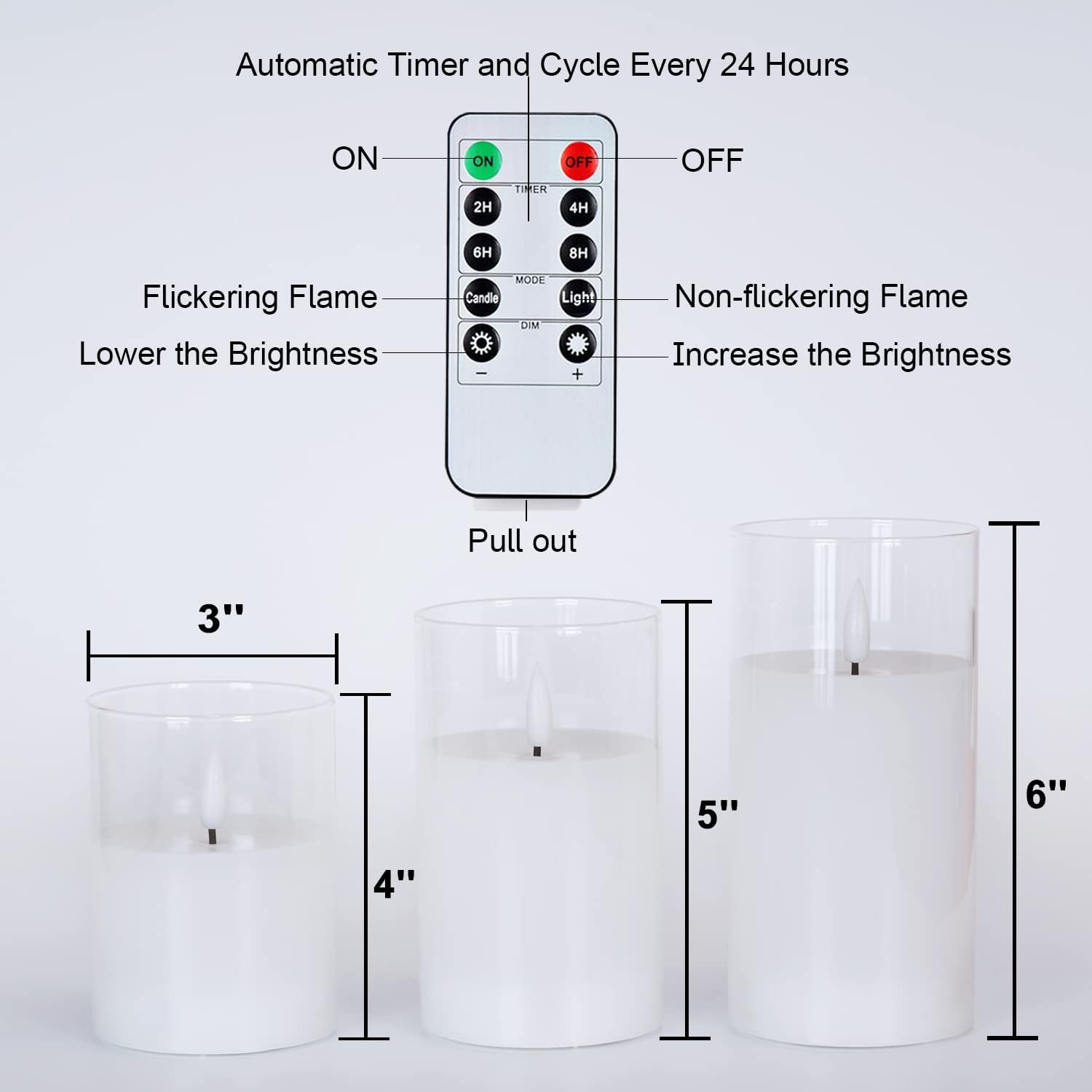 - Package Includes: This glass candle set includes three flameless pillar candles(D3”x H4”5”6”), a 10-key remote control, and one user manual. Each battery candle is powered by 2 x AA batteries (not included) which can live up to 500+ hours.