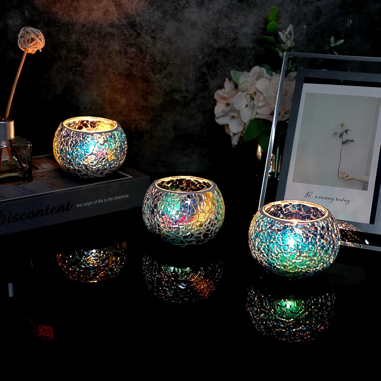 - Package includes 3 glass mosaic tea light candle holders, overall dimension (Width x Height x Opening Dia) is 8.5cm x 6cm x 5.5cm / 3.3” x 2.4” x 2.2”, suitable for placing tea light candle, votive candle, pillar candle, or more candles.