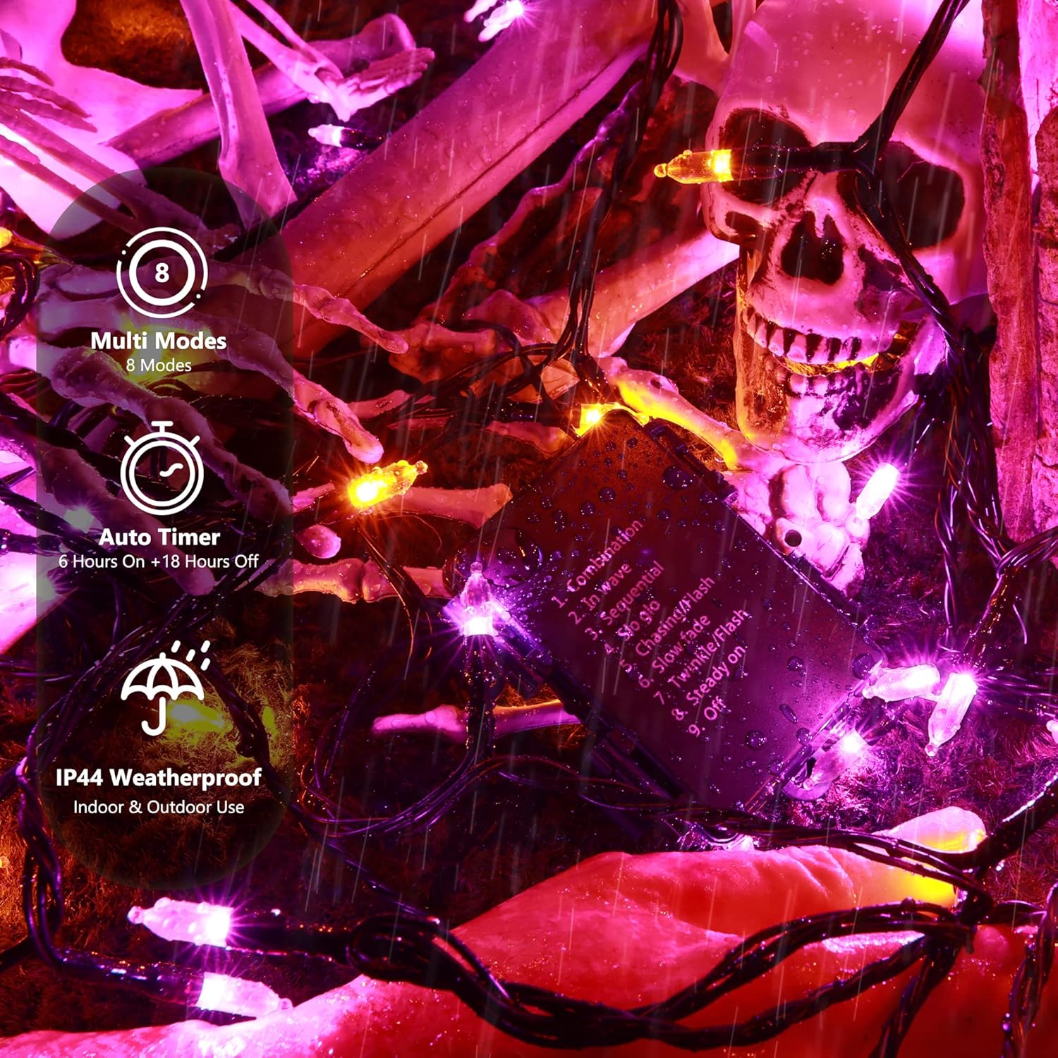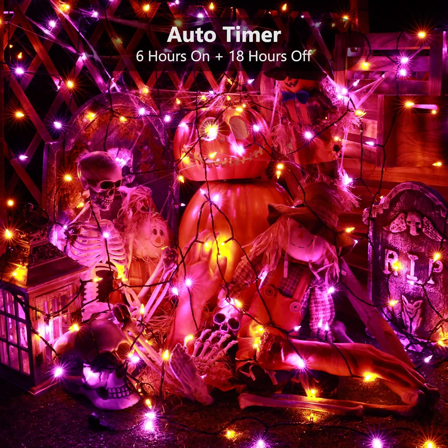 - 8 Modes & Auto Timer: These purple+orange halloween string lights have 8 gorgeous lighting modes with built-in auto-timer 6 hours "ON" and 18 hours "OFF", which starts once you activate any one of the 8 modes on the battery holder, so it will automatically time when the light is on. Note: If you change modes before the timer expires then it will stay on that mode for another 6 hours.