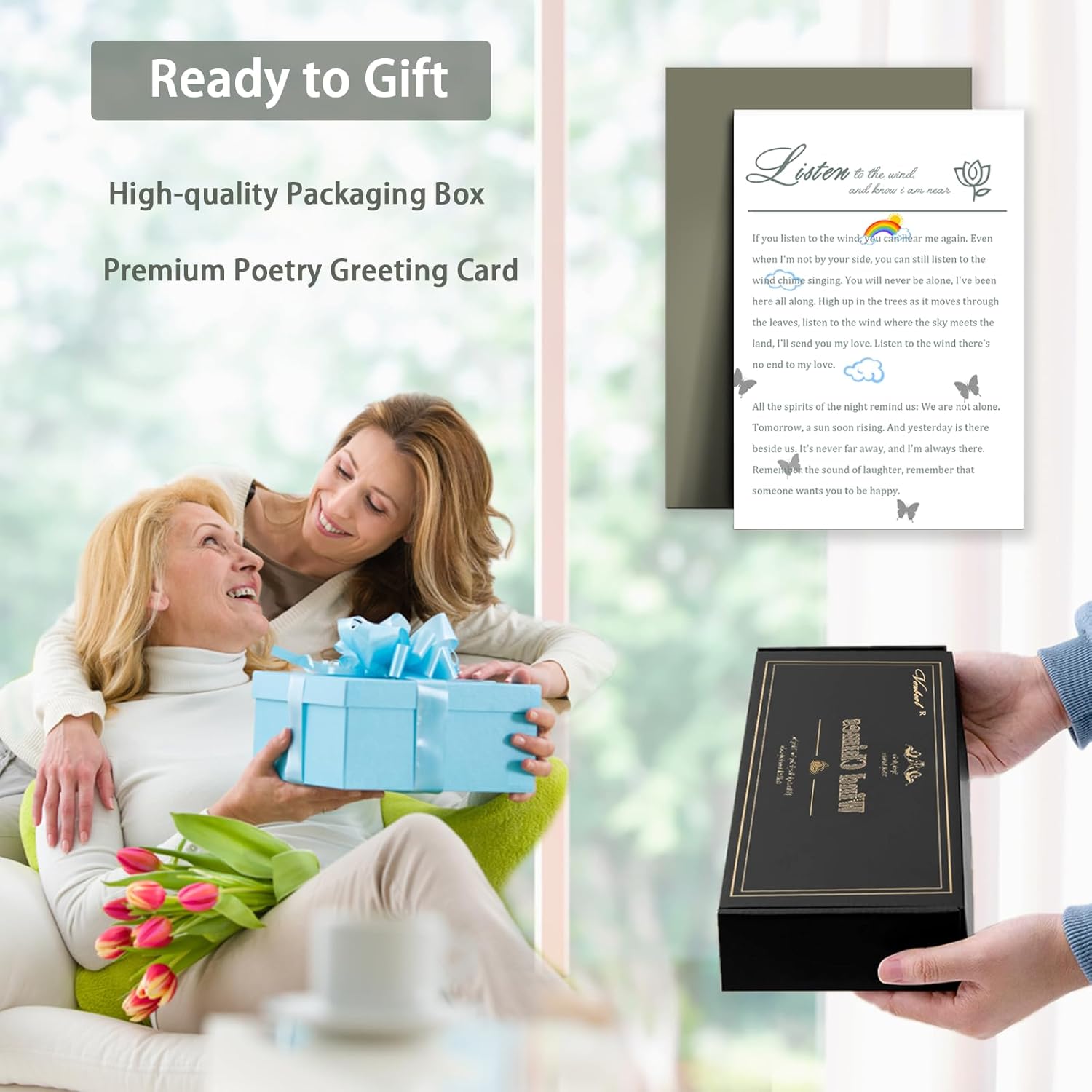 - IDEAL GIFT CHOICE -- The butterfly gifts come in beautiful boxes and come with an exquisite card, making them a great gift choice. The delicate and elegant butterfly wind chime is not only a great gift for mom, grandma, mother-in-law, women, and girls, but also suitable for most festivals and occasions, such as Mother's day, Teachers' Day, Thanksgiving, Christmas, Weddings, Birthdays, etc.