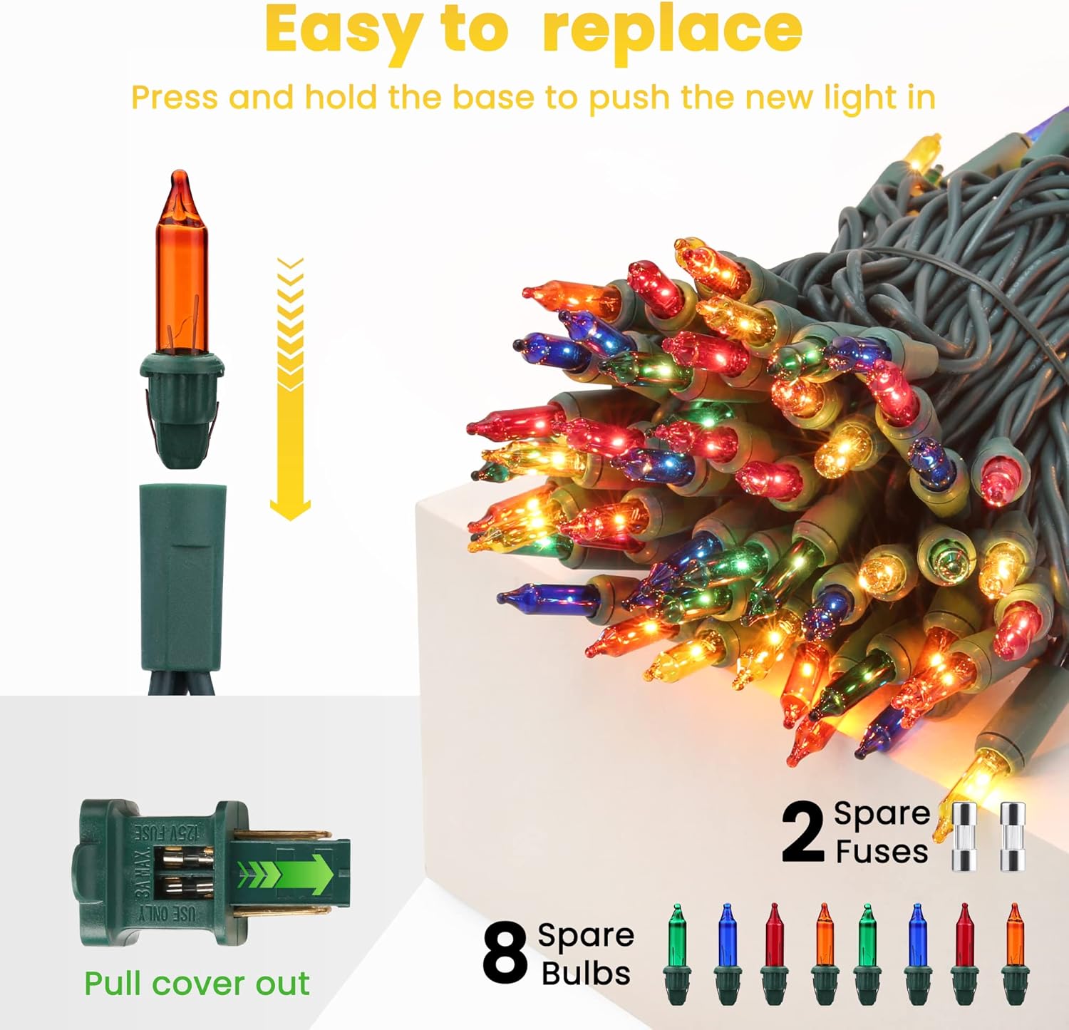 - š Specification & Quality Customer Service: 300 count mini bulbs, 75ft long strand, the length between 2 bulbs: 3inch. Come with 4 spare bulbs and 2 spare fuses. Toodour provides 30-day money-back and 12-month replacements. If you have any questions, please feel free to contact us.