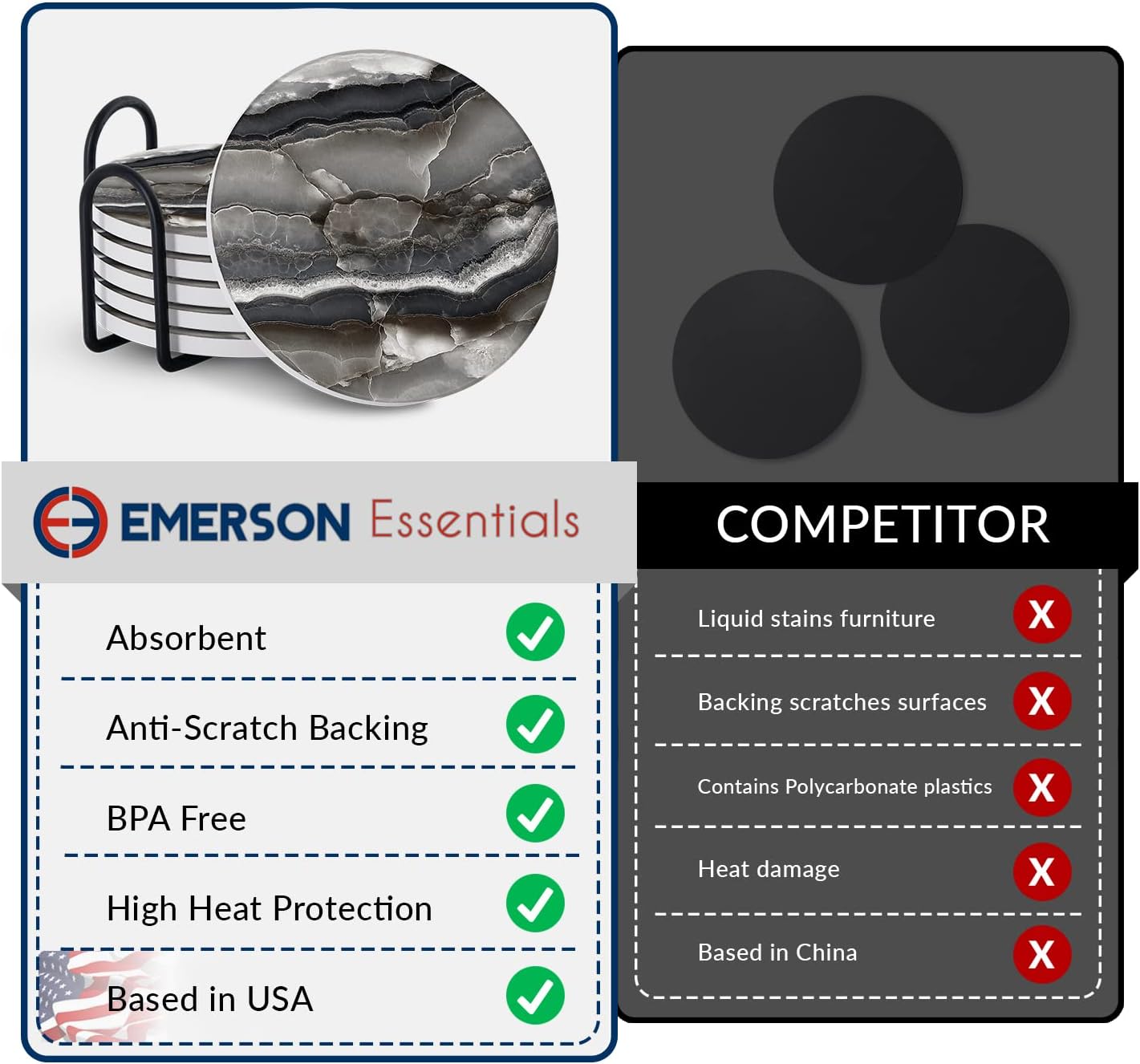 Emerson Essentials Coasters for Drinks Absorbent with Holder, Set of 6, Cork Backing Ceramic Stone Marble Style for Wooden Coffee Bar Tables, Glass Tabletop Non Slip, with Stand