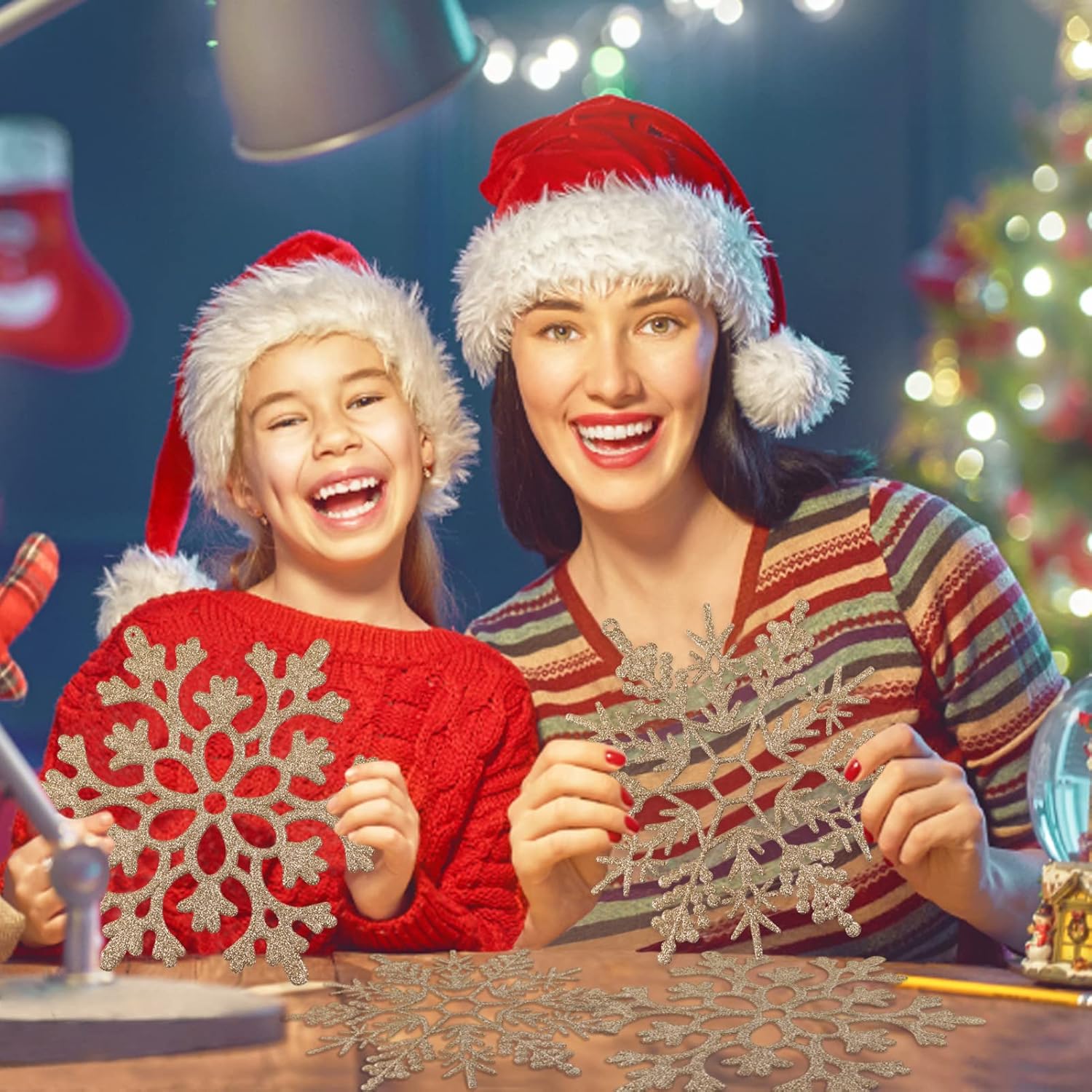 - SNOWFLAKES FOR CHRISTMAS: Featuring sparkly glitters on the surface, these champagne gold glitter snowflakes tree ornaments add much more sparkle to your Christmas tree decorations, they also look gorgeous on windows, ceiling, fireplace, outside yard, porch etc, perfect winter decorations snowflakes; Besides, they are excellent for frozen theme birthday party, winter wonderland birthday party decorations
