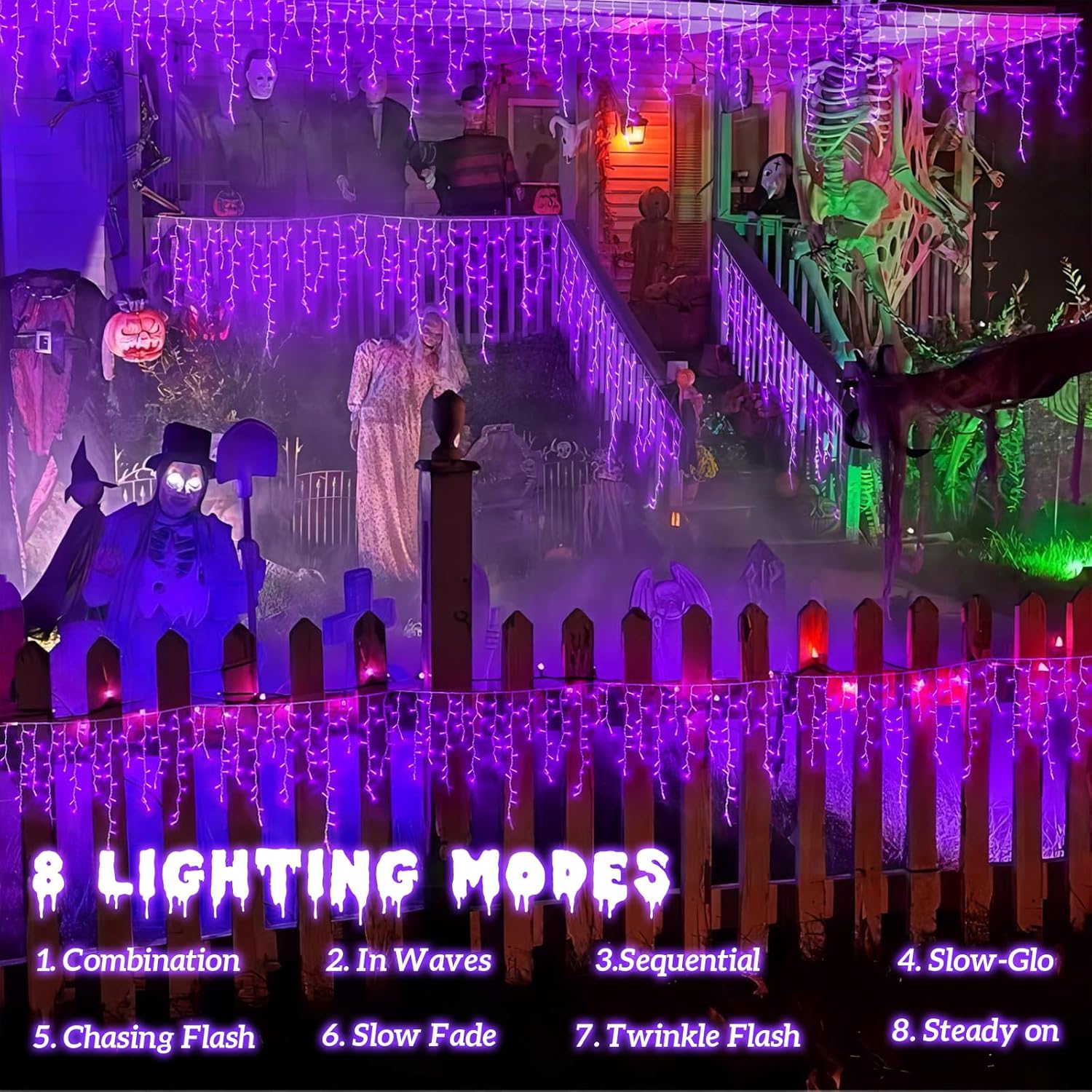 - 8 Lighting Modes: Icicle christmas lights has 8 lighting modes (combination, in wave, sequential, slo-glo, chase/flash, slow fade, twinkle/flash, steady on). Different lighting effects are controlled by the adapter button. Change the mode as needed to attract and surprise your neighbors! Icicle christmas lights will be a eye-catching decoration at your party.