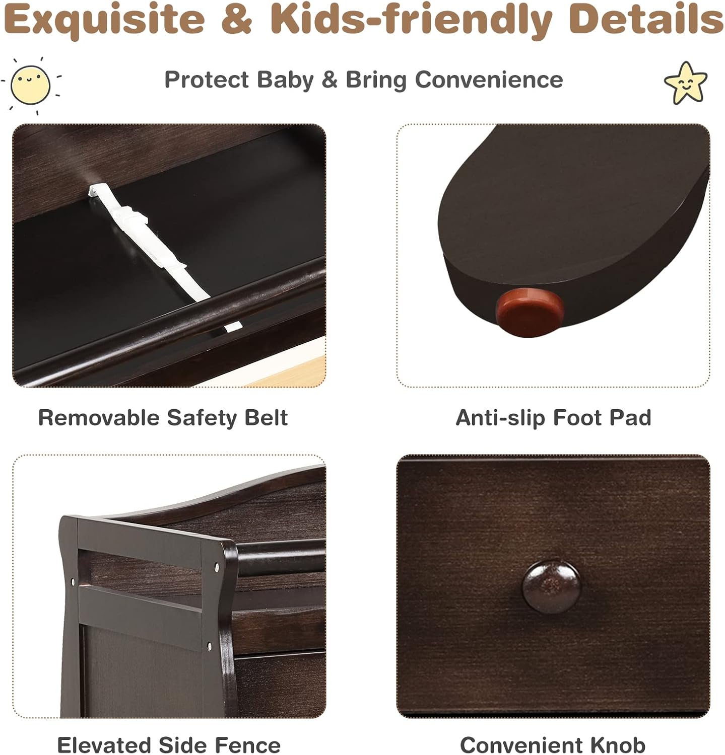 - Safe & Stable Construction: The changing table dresser is strongly supported by four sturdy legs and the changing top can hold up to 176 lbs. Each leg is equipped with anti-slip foot pad to avoid slipping and wobbling. Plus, safety belt and raised rails will help protect your baby from falling.