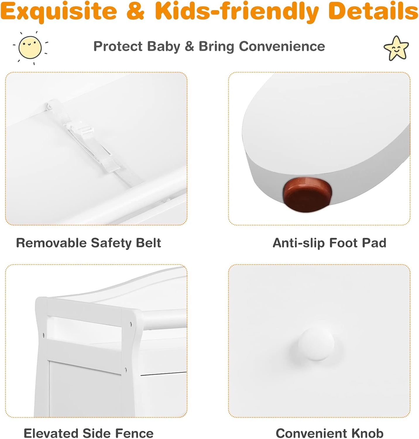 - Safe & Stable Construction: The changing table dresser is strongly supported by four sturdy legs and the changing top can hold up to 176 lbs. Each leg is equipped with anti-slip foot pad to avoid slipping and wobbling. Plus, safety belt and raised rails will help protect your baby from falling.