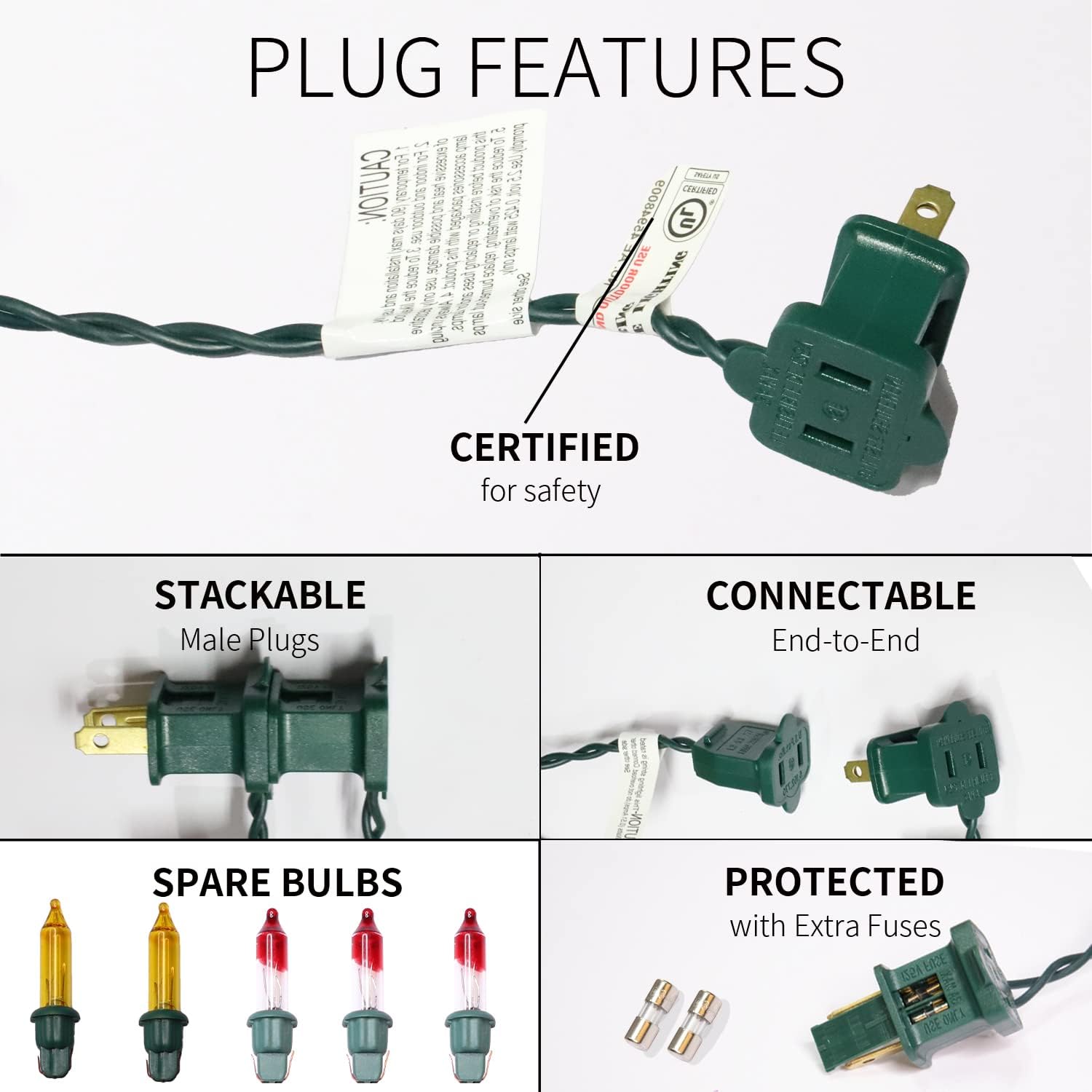 - Product Nature:Each mini Christmas light set comes with end-to-end plug, can be connectable up to 3sets (450 lights). Each bulb space 2.5in, 2.5V and 0.425W per bulbs, built-in 3A fuse for safe use. Extra bulbs and fuses are included.