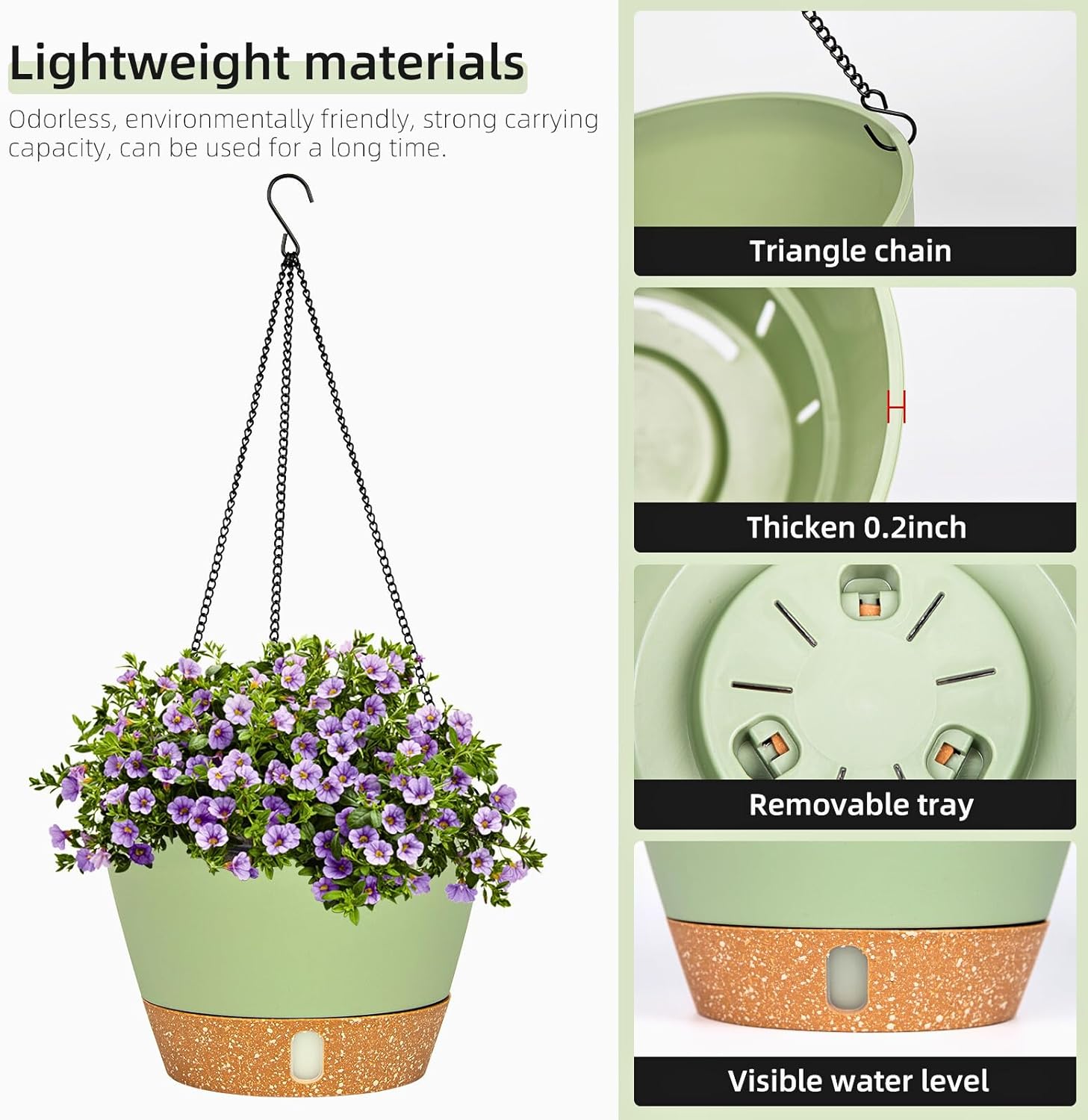 - SELF WATERING & VISIBLE WATER LEVEL: Self watering hanging pot is ingeniously designed, tightly connecting the tray and the pot body, turning the tray into a water reservoir with visible holes, allowing you to clearly see the water level (If you water too much, water will flow out from the edge of the tray to prevent the plants from being submerged)