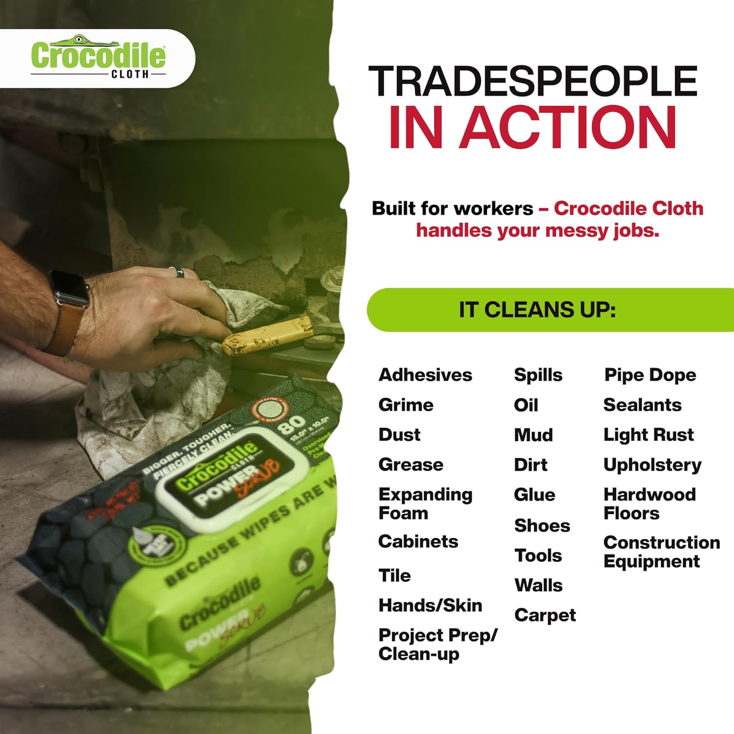 - More Effective, More Value: Giant 15" x 10" Crocodile Cloth Power Scrub wipes are our toughest cleaning wipes yet. One side is smooth to polish plus absorb, while the other side has teeth to scour plus scrub for your worst & gunkiest messes.