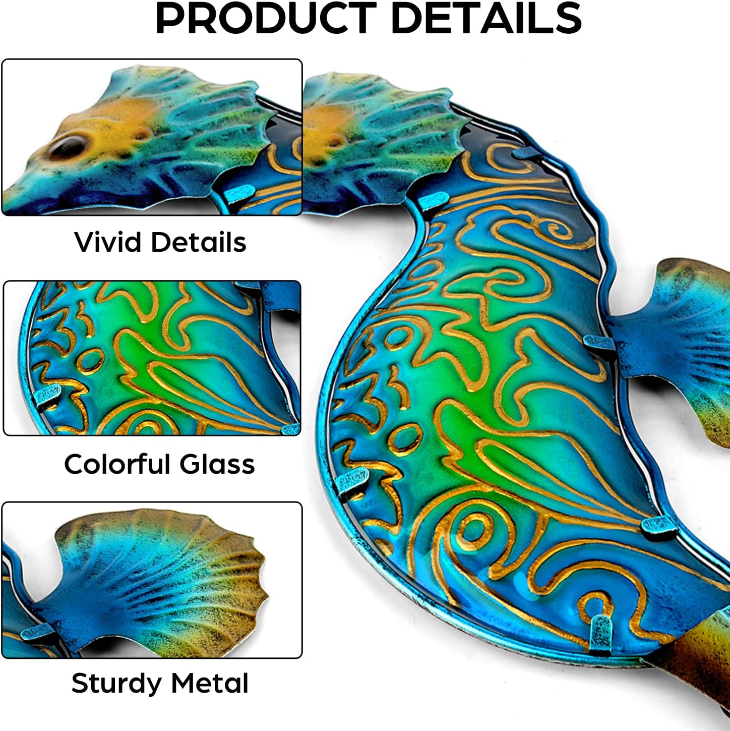 - Product Details - You will get include 1 piece seahorse decoration - Measure 15.9 x 7.9 inches. The vivid metal seahorse wall decor matches is perfect for any decor style and can be displayed in bedroom, living room, office, study, baby room, kitchen, yard, porch, patio, garden and more