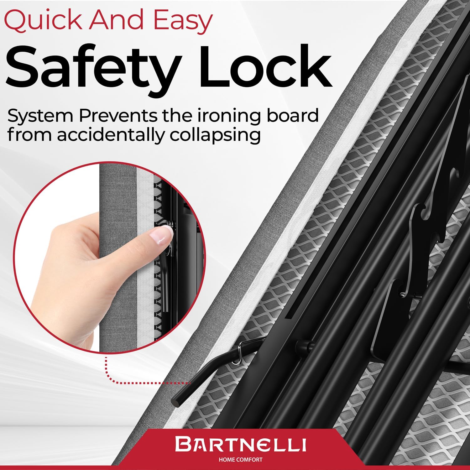 Bartnelli Ironing Board Made in Europe | Iron Board with 4 Layered Cover & Pad, Height Adjustable up to 36" Features A Safety Iron Rest, 4 Steel Legs, for Home Laundry Room or Dorm Use (43x14)