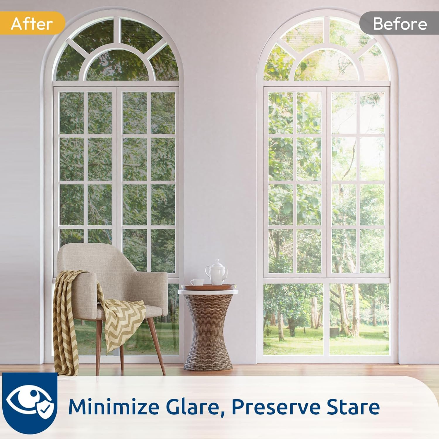 - UV Protection & Reduce Glare: Blocks up to 90% of UV rays, this sun blocking window film helps to keep your flooring, furnitures, blinds, and draperies from fading. 28% of VLT helps effectively reduce glare and let some visible light in, creating a more comfortable and safer indoor environment for you