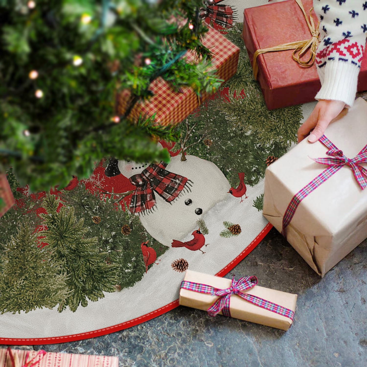 AVOIN colorlife Cardinals Cedar Snowman with Scarf Christmas Tree Skirt, Xmas Winter Holiday Party Tree Mat Indoor Outdoor Decoration 36 Inch