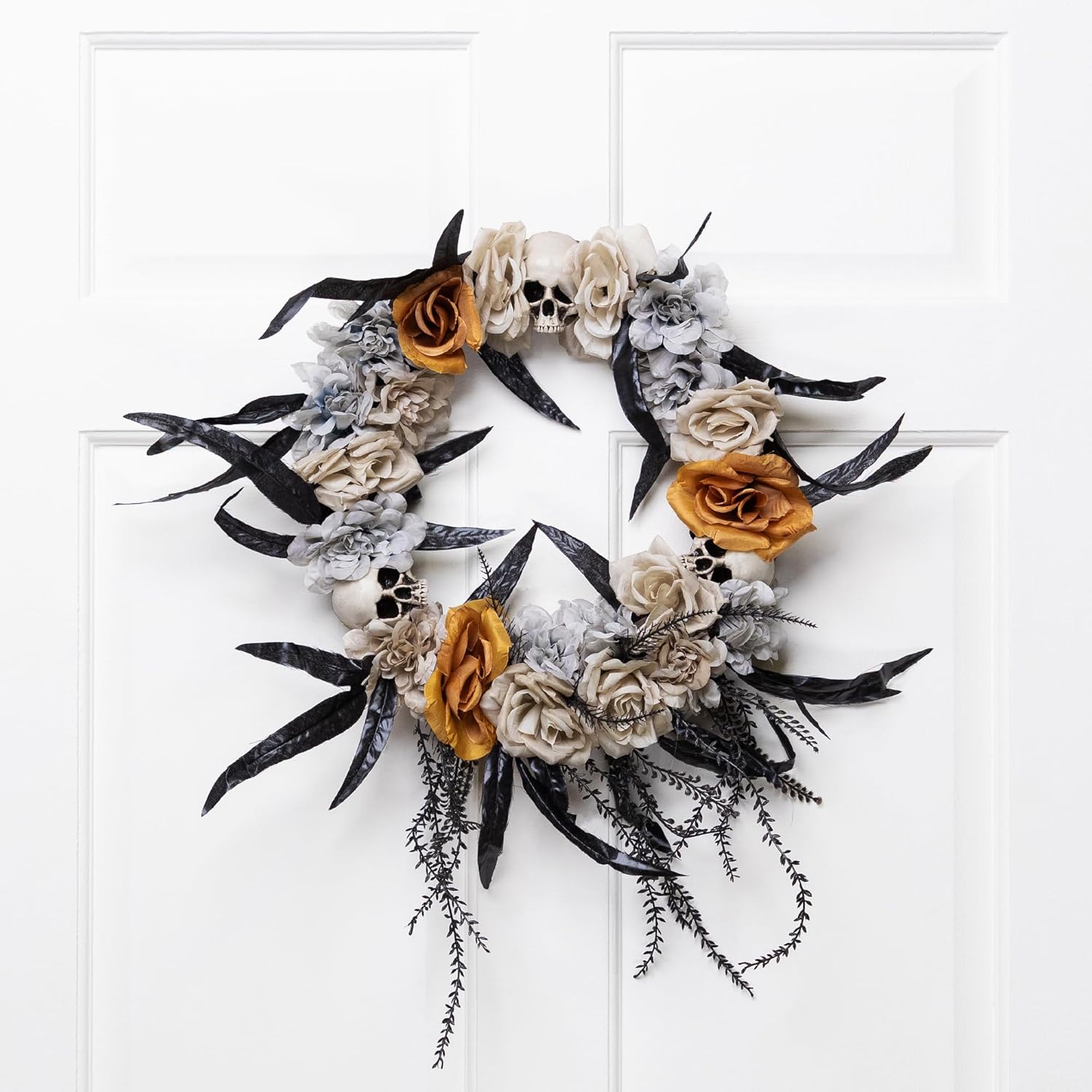 - Skulls With Orange And Gray Roses Halloween Wreath