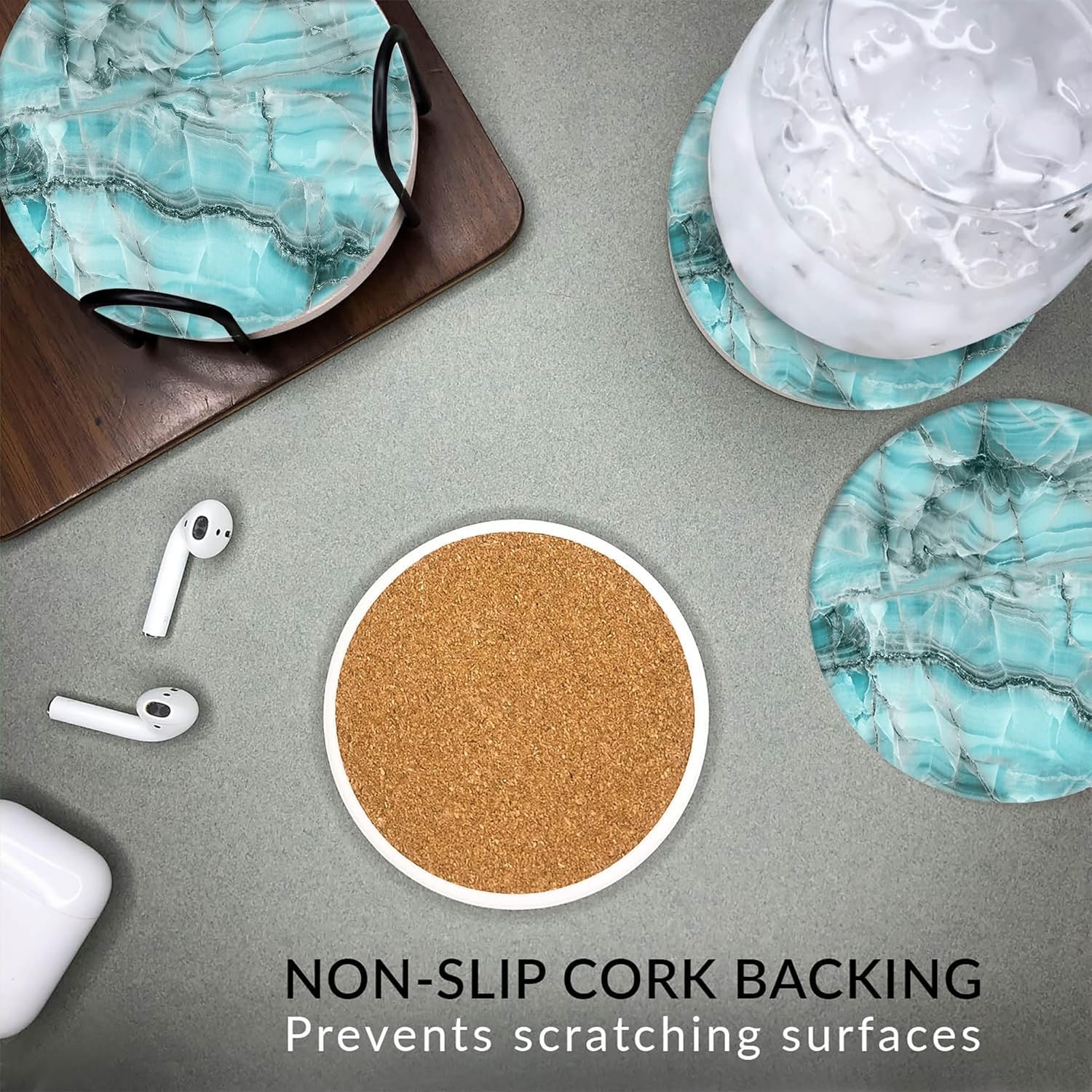 - FULL COMPREHENSIVE PROTECTION – The stone coasters feature non-slip durable cork backing to protect countertops and desks from scratches even from thirsty drinkers! The non-sticky corked backing base helps the coasters stay in place and prevents scratching your glass or wooden countertop tables.
