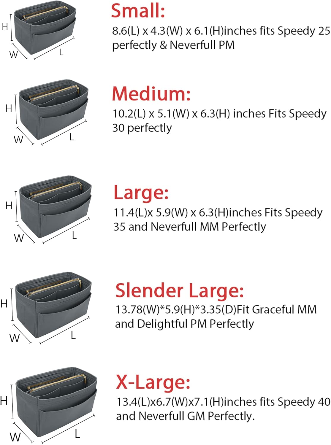 • SIZE OF BAG ORGANIZER: Medium: 9.25(L)*5.9(H)*5.1(W) inch Fits Speedy 30 Perfectly. Slender Medium: 11.2(L)*6.5(H)*3.2(W)inch Fits Graceful PM. Large: 11.4(L)*7.1(H) *5.9(W)inch Fits Speedy 35 and Neverfull MM Perfectly. Slender Large: 13.78(L)*5.9(H)*3.35(W)Fit Graceful MM and Delightful PM Perfectly. X-Large:13.4(L)*7.1(H)*6.7(W)inch fits Speedy 40 and Neverfull GM Perfectly. Portable and Compact Purse Perfectly For any Brand.L*H*W means (Length*Height*Width)